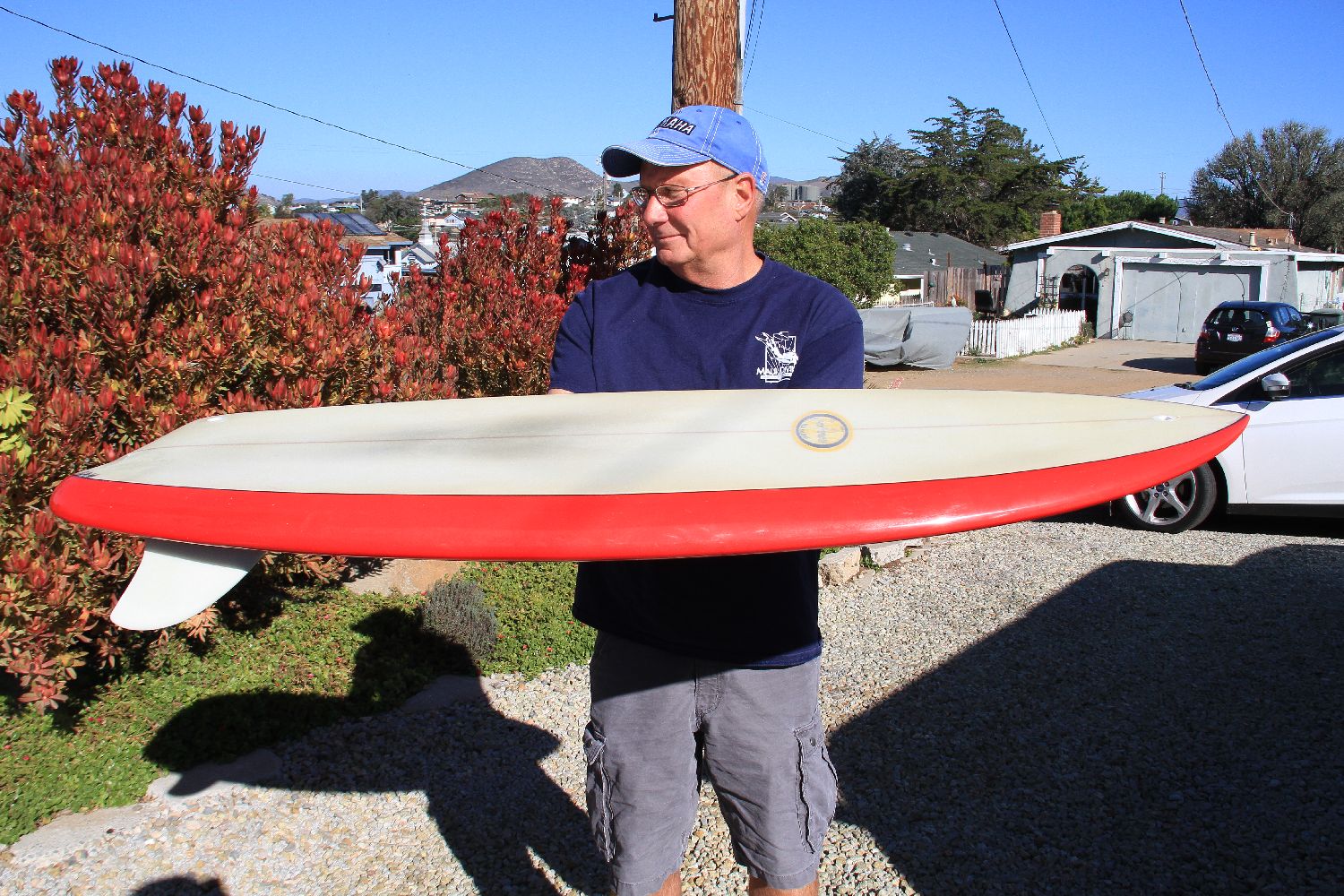 Thought I'd post up a few photos of a buddy's board, he was by earlier today enroute to the ding guy with it. It's not a Mega Platter...... so what's it doing on this thread? Well...............I thought it might be more 'comfortable' for some of you to see a board more this size. This board is in absolutely perfect condition (except for that small ding.......though it's over 15 years old. We used to get all of our boards shaped by by local SLO County wizard Dave Parmenter, and this was one of several belly devices that Dave carved out for us.
