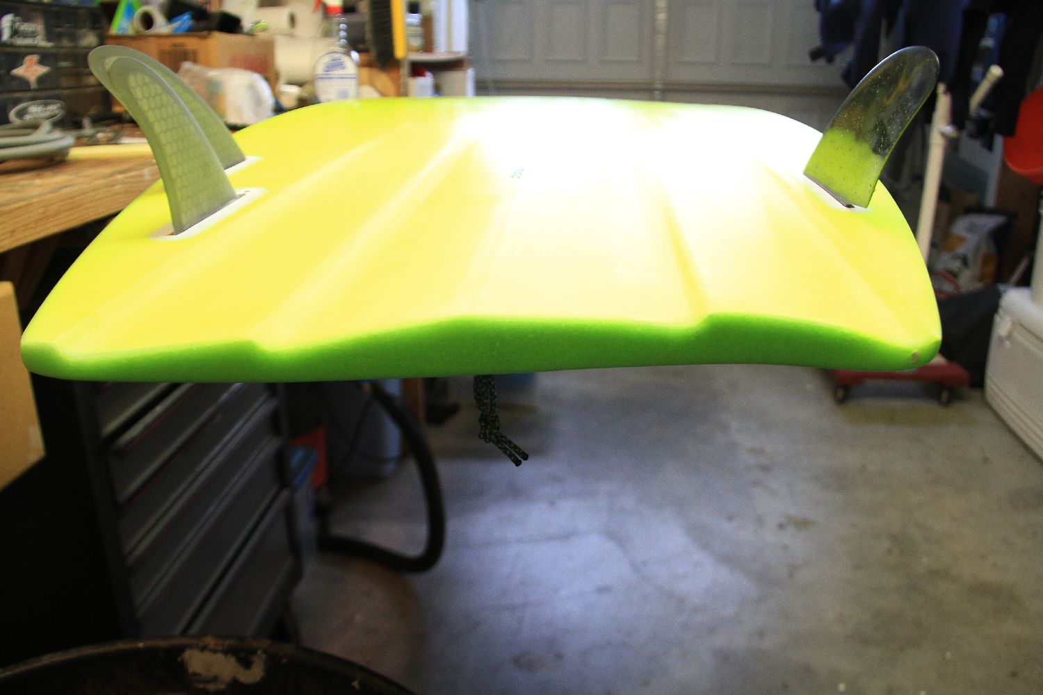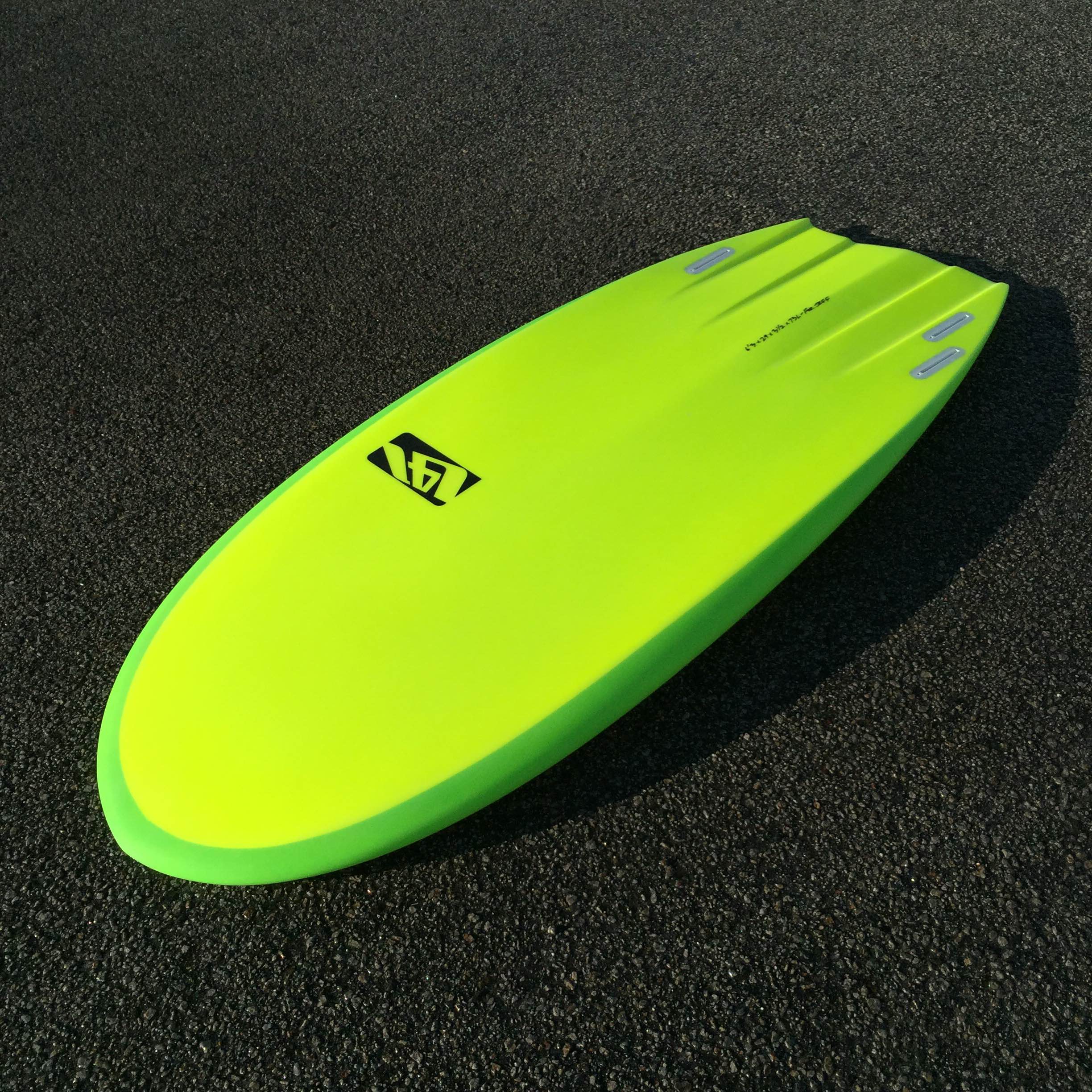The shorter rail (cutback side) is 3" shorter than the bottom turn rail. Fin size? Just going with what I've been experimenting with on the 'regular templated' boards, which is the Rasta keel fin for the cutback rail, and a Futures quad (half of) for the bottom turn rail. This is just what I've 'started' with, and what has given me good results. Ask me in 6 months and I might have a whole new set of fins on here. Gotta start somewhere, and this is it; it's an ongoing process.