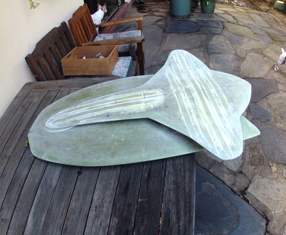 The glassing is finished, the strut s have finished well, and the idea on this one is to clean up the water flow between the split decks. The final sanding has revelled some pleasing lines