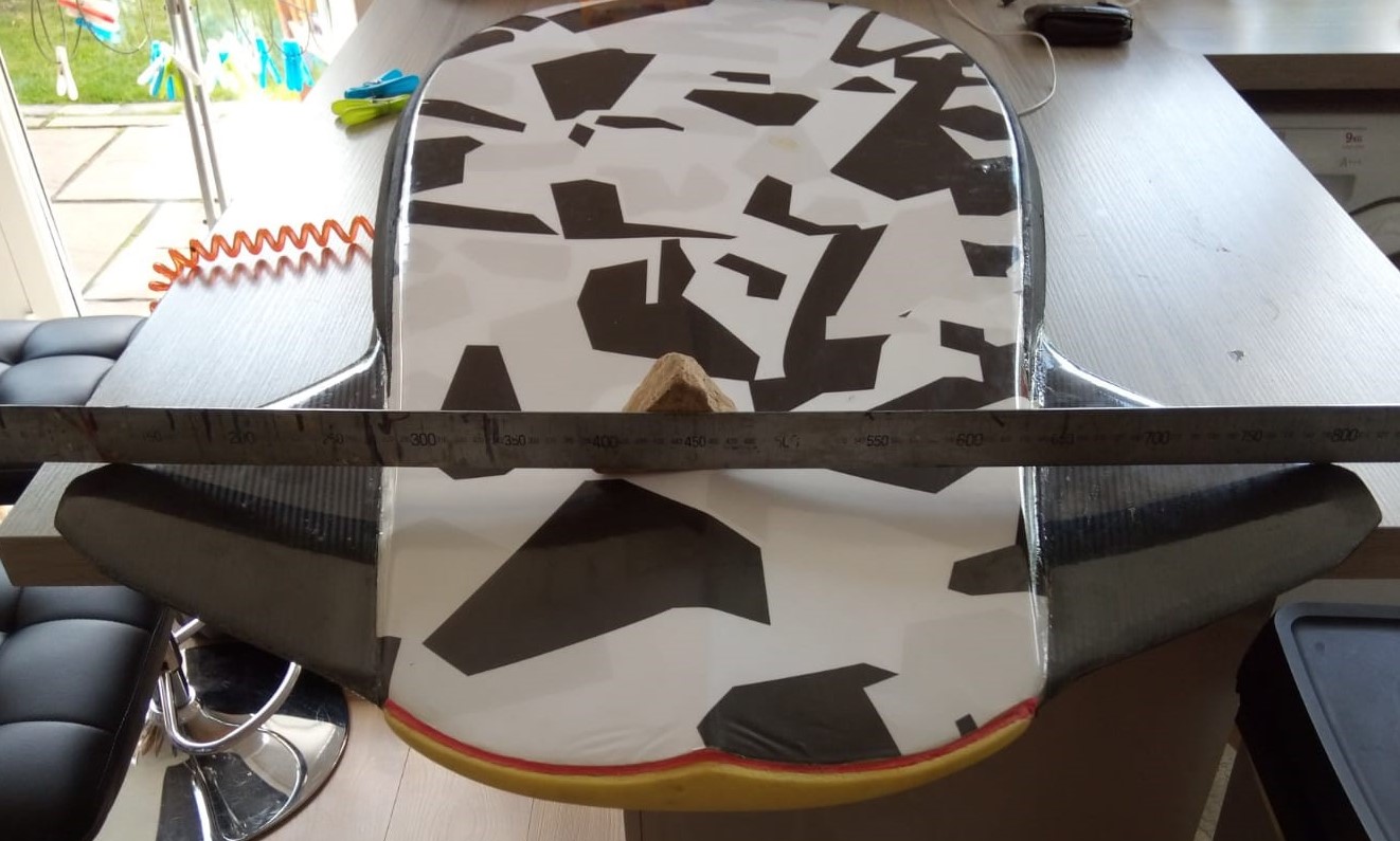 I have survived the tropical Indian ocean to North Sea transition .I am now a Cayton bay local ,my first experiences was in 9c water without a hood and got my first duck dive ice-cream headache , but the stoke is back .Getting out off a winter wetsuit after a 3 hour surf is somewhat difficult. We are going through a summer wave drought. The fins are at the back around the hips area the boards are bottom up in the picture; they have an amazing gliding feel when paddling. Tips stick out 160 mm, 700 mm between tips, the board is 1150mm long, and 55mm thick .The airex is two layers of 5mm with a layer off 6oz cloth between layers and one top and bottom and extra over the fine tips for strength. The rocker and fin angel is set with batons and cured in a homemade Utube design oven. I have tried hex core foam but it is very resin rich and a bit heavy