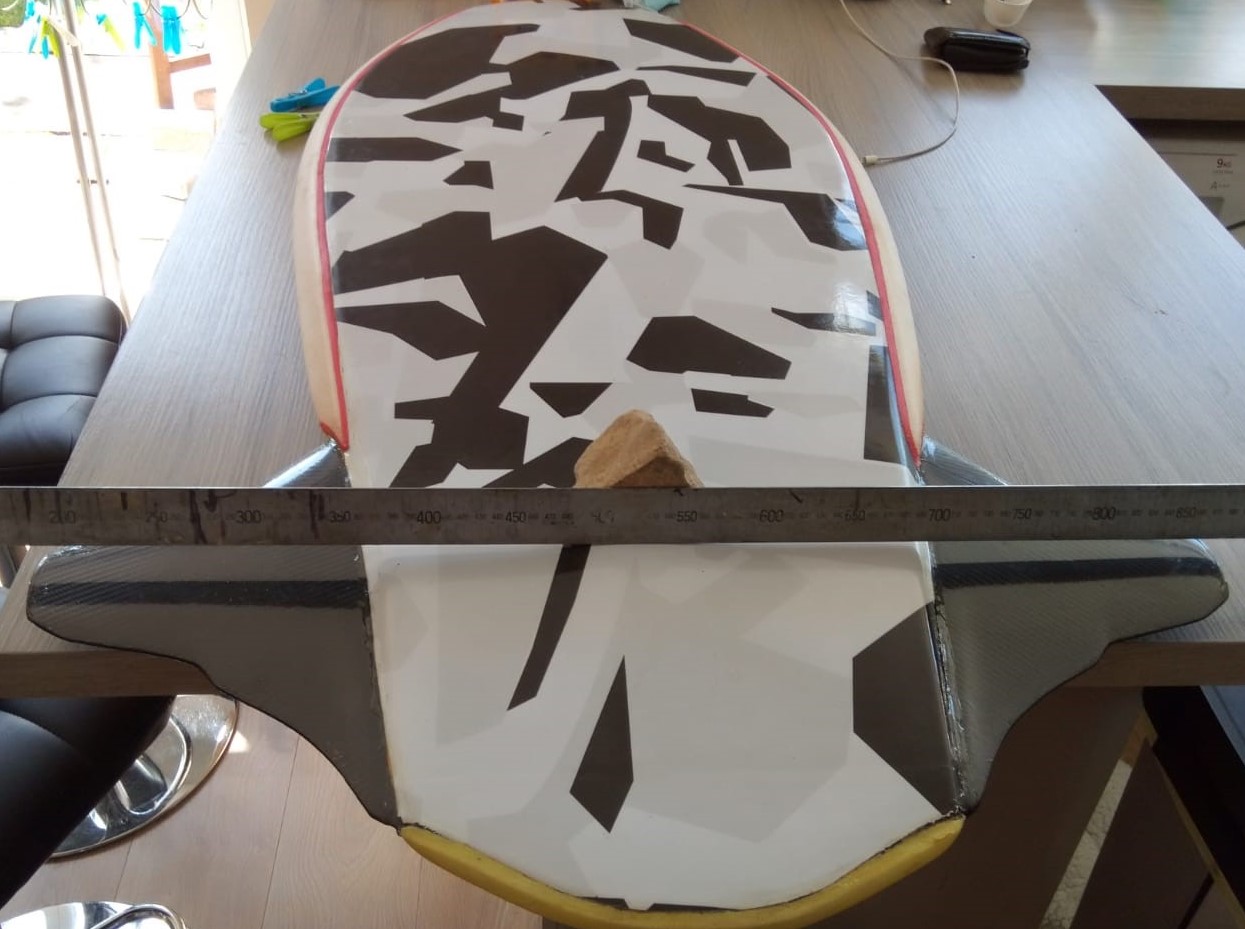 On the green board, if I put a spirit level on the bottom, from one rail to the other rail, by 20" from the tail the spirit level is flat on the bottom. By 25" from the tail, the wings are completely gone and the spirit shows a small gap around the rails.