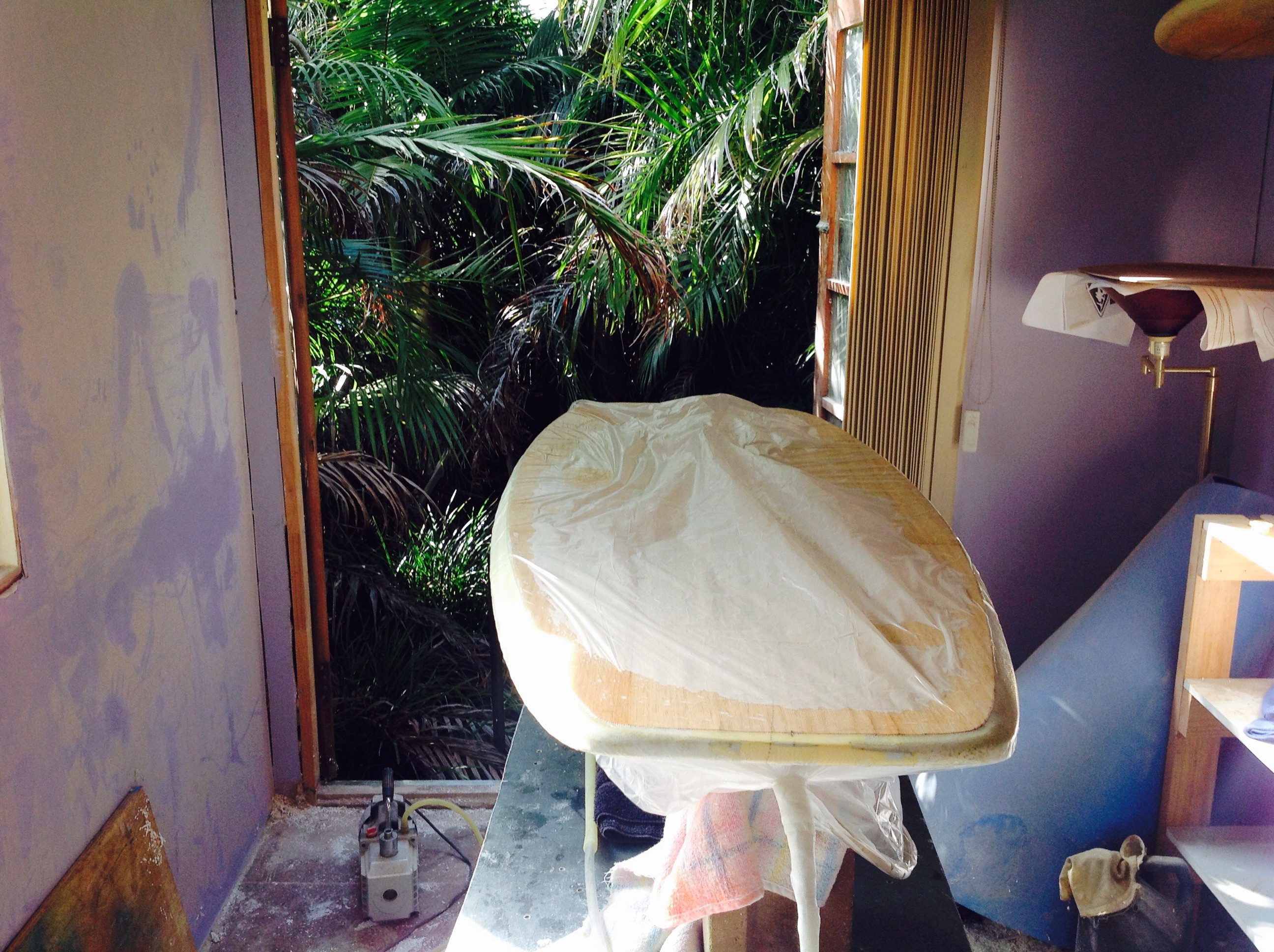 Vac bagging is the way to go esp for prone boards. Put the foam shape with wet glass in a bag and attach a vacuum hose and in a few hours it's set, flat, and the vacuum sucks away excess resin so it's as light as possible.