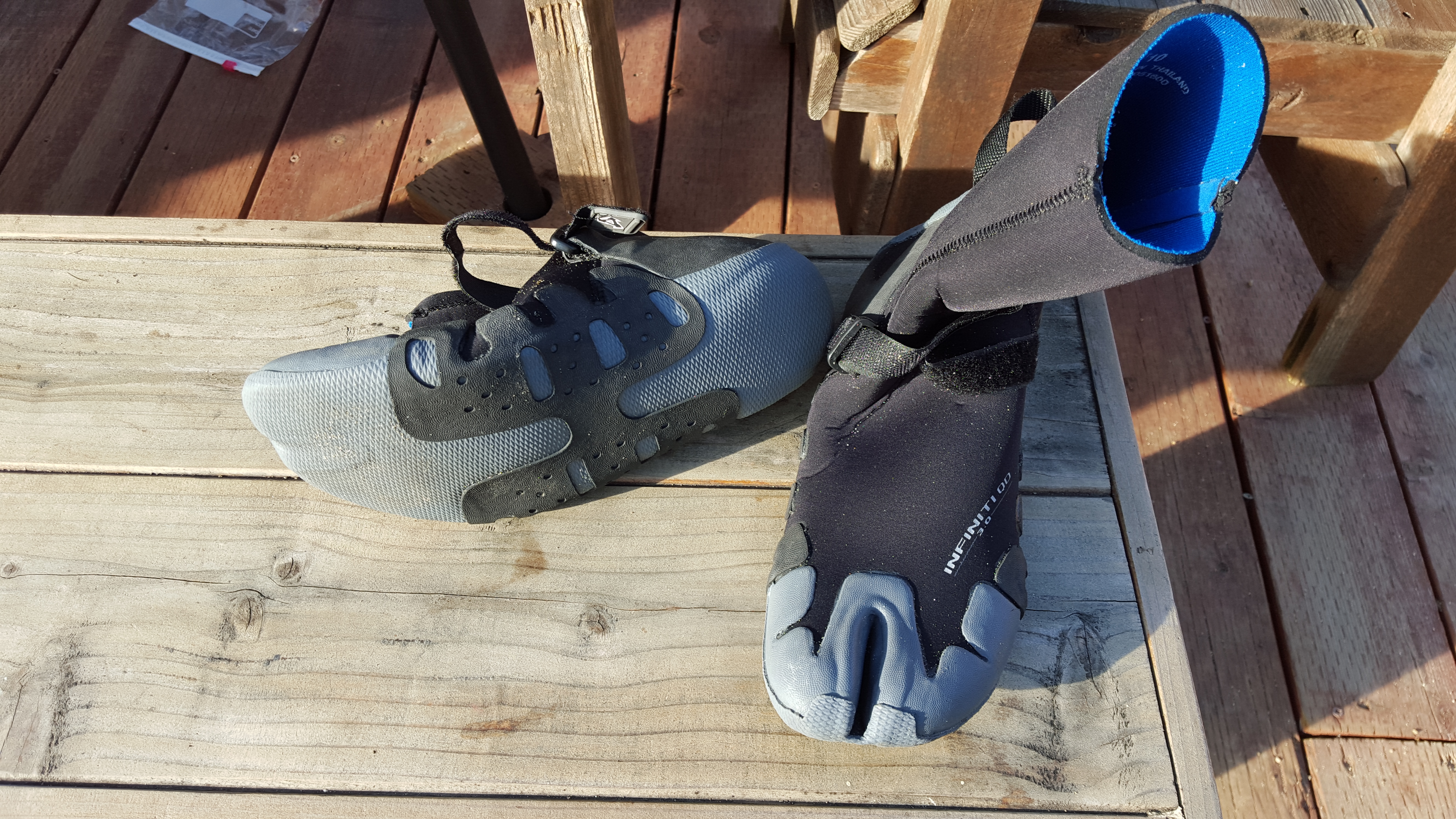 I know 2mm fin boots don't work. I found a pair in my truck that I had only used once and thought they might work well for the XL UDTs. Much easier to put on, and protective enough (although heel was open). Biggest concern was keeping the big UDTs on in the OH surf encountered during this morning's session., No problem, stayed on and actually felt pretty snug (thanks to my wide feet). Problem was I found a quarter-sized hole in the sole when I took them off. And these were brand new! Really need that extra thickness in the sole, but then even my 3mm booties have holes in the soles. Felt may be the answer.