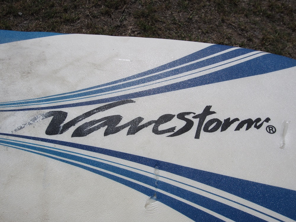 Deck-down view...notice the various curves all over the board. You can't even see the weird dents on the bottom skin. One of the rails practically curves in and out. I laugh when I think about reading that various pro surfers can feel thickness variations of less than a quarter of an inch. In the Wavestorm world and especially in the Wavestorm Frankenstein world I suspect anything goes. And probably not well...