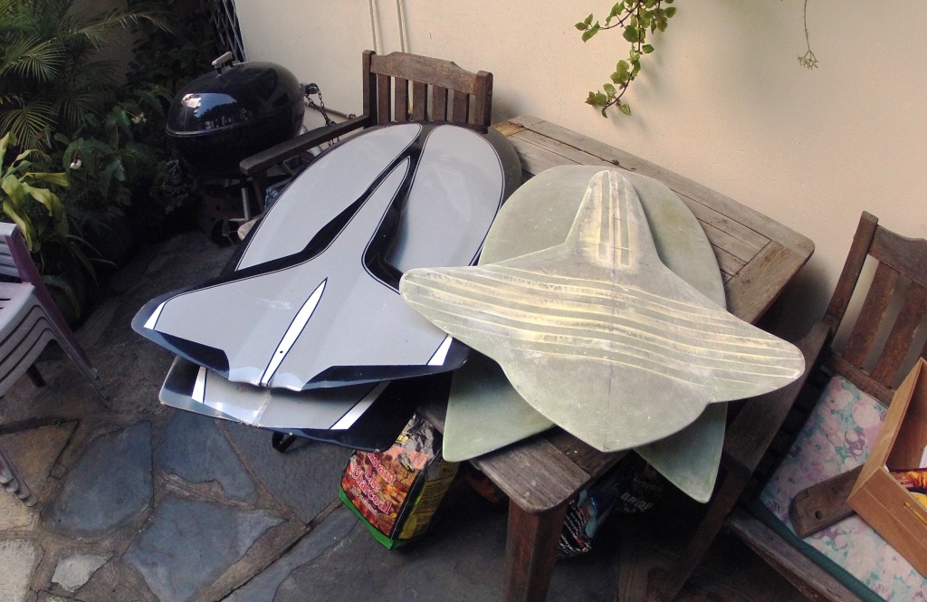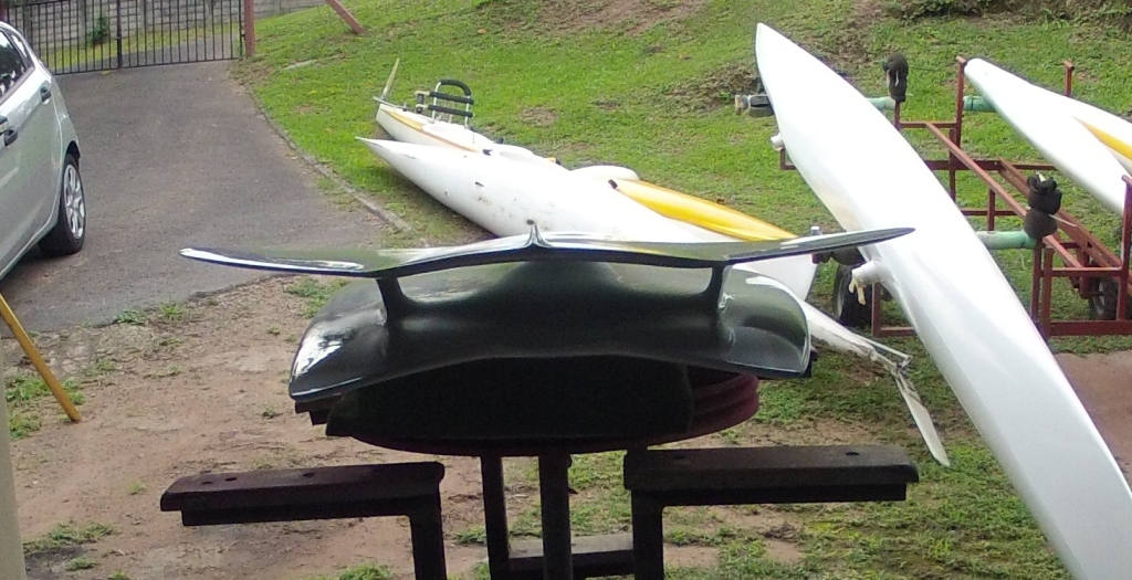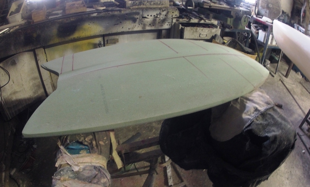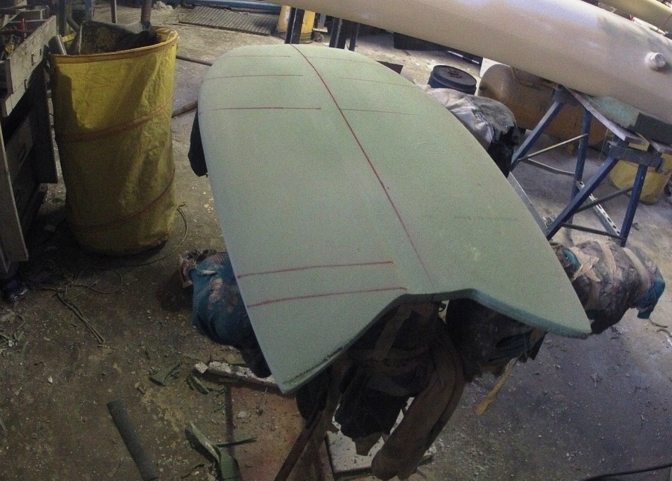 The glassing is finished, the strut s have finished well, and the idea on this one is to clean up the water flow between the split decks. The final sanding has revelled some pleasing lines