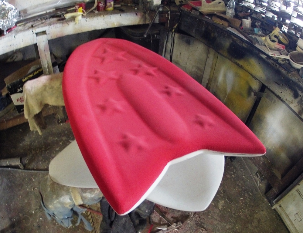 Thanks Tim this one will be plain white with a red foam deck to use up left over’s. Did you pick up that all the contours, were prest out of laminated flat 9mm foam sheets, so there is very little foam lost setting the rocker, it holds dome and flat radii well.