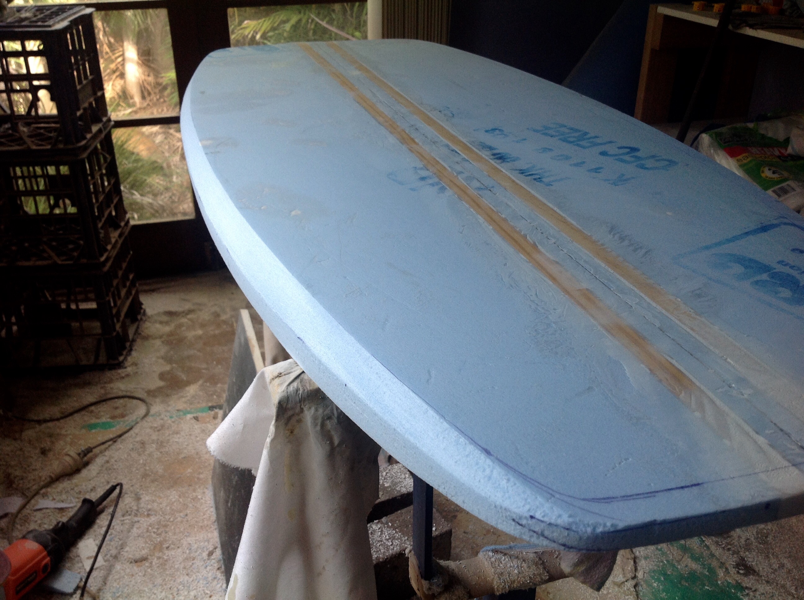 Previously I've use a standard foam bodyboard and bolted wooden strips to both sides but it looks ugly so this time I've hidden the stringers insider the board, once it's glassed people won't know they're there.