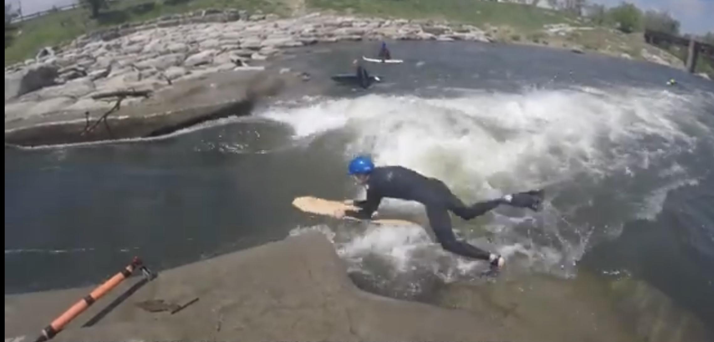 Here is another video of Longboard Bill river surfing his handmade bellyboard on “Wave Sixx” at River Run Park minutes from Denver, Colorado in a cool town by the name of Sheridan that helped pay for this wave to be built along with its neighboring town of Englewood.