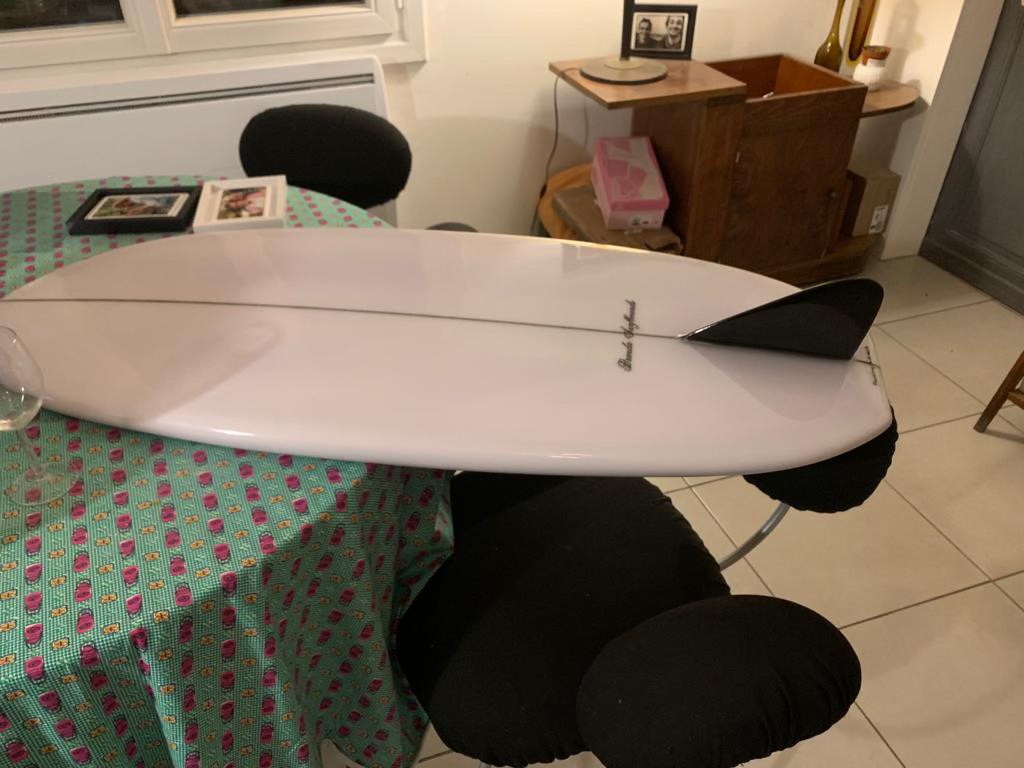 in reality, it's my second board but the first alone. I learn since a few time with a famous shaper in France Daniel's longboard (biarritz). this board have some defaults who don't really see in this picture.I practice belly shaping before shaping surfboards.