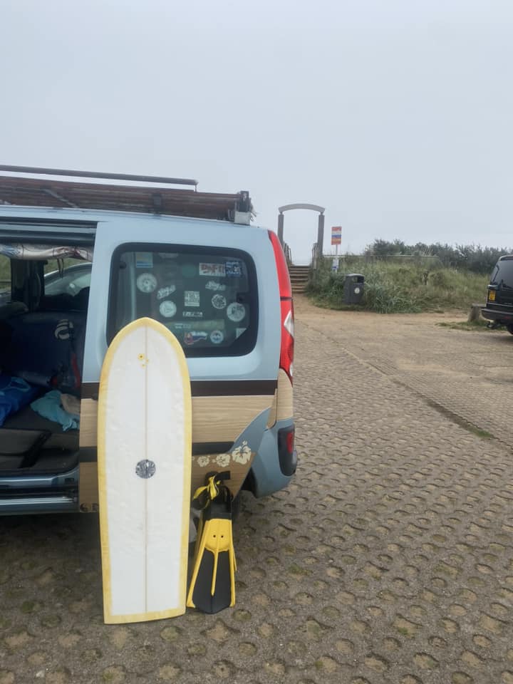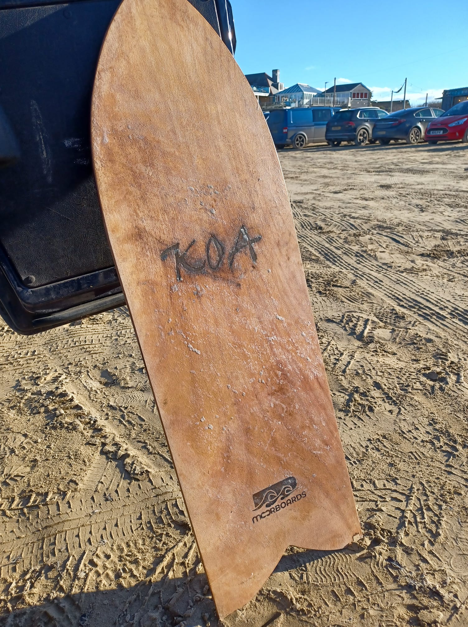 It’s about 20mm thick, shaped like a regular boogie board and made entirely of cork. It was shaped by a guy called Dave Hahn in San Francisco. He stopped making them about 5 years ago so I scoured the planet and managed to find a few blanks. It absolutely flies and is super-easy to punch through the big stuff because it’s only just positive buoyancy.