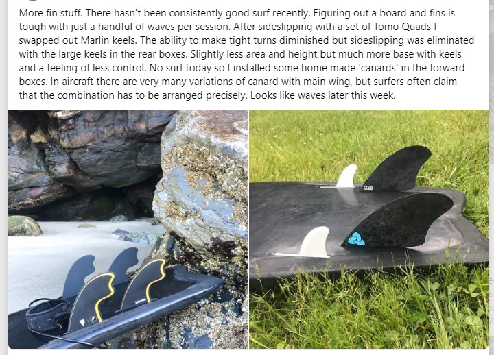 More fin stuff. There hasn't been consistently good surf recently. Figuring out a board and fins is tough with just a handful of waves per session. After sideslipping with a set of Tomo Quads I swapped out Marlin keels. The ability to make tight turns diminished but sideslipping was eliminated with the large keels in the rear boxes. Slightly less area and height but much more base with keels and a feeling of less control. No surf today so I installed some home made 'canards' in the forward boxes. In aircraft there are very many variations of canard with main wing, but surfers often claim that the combination has to be arranged precisely. Looks like waves later this week.