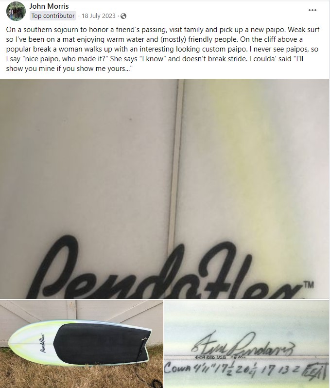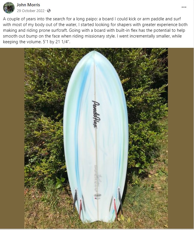 Eventually I contacted different shapers and got boards that work much better. In the process I became better able to ride waves how I wanted, based on nearly 60 years of standing up on a board, whether short, long or mid-size. My current quiver is temporarily drying out for repairs so I've been surfing the original Frankenstick, and... it's working great in small local summer surf. In addition to whatever improvements were achieved through modification, I've become more adept at prone surfing from riding my other, better boards. Most notably, I'm more confident when things get hectic and keep my weight forward, initiating turns with knee pressure, a technique that requires a board long enough for the knees to be in contact with the deck.