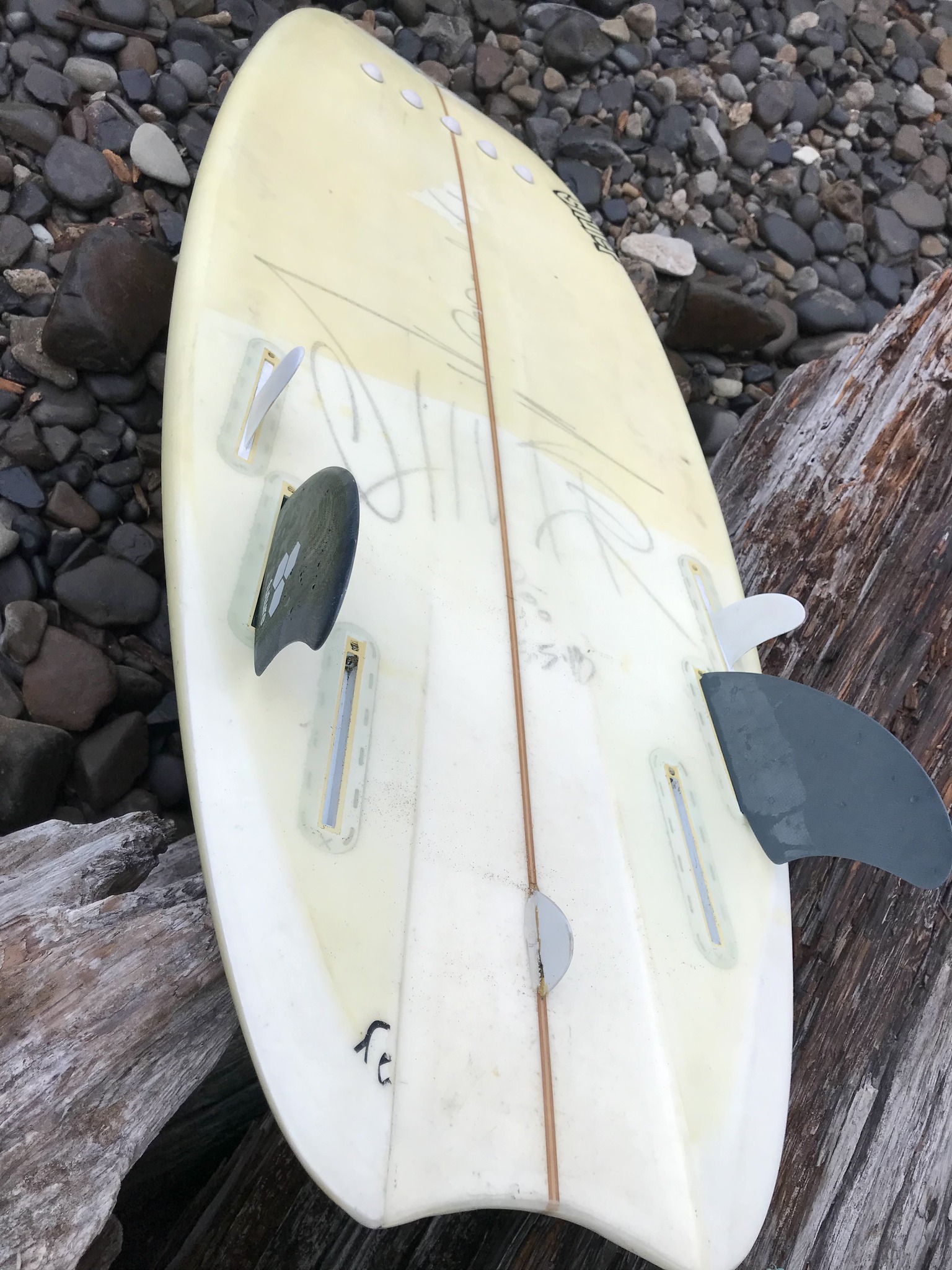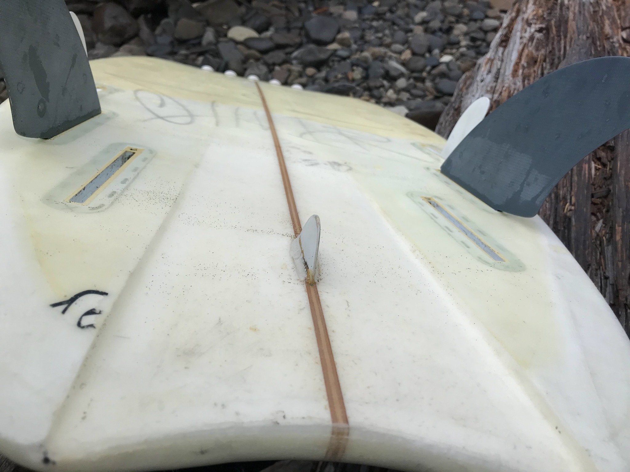 I've got several fin arrangements (twin, quad, tri, five fin) to experiment with before considering modifying the board. There's a Futures center fin box under the rubber that I can access if it comes to that. My fin inventory reflects my concern that anything too big is asking for trouble if I ever contact my fins in a wipeout. I've also felt (irrationally?) that fins further back are more of a hazard.