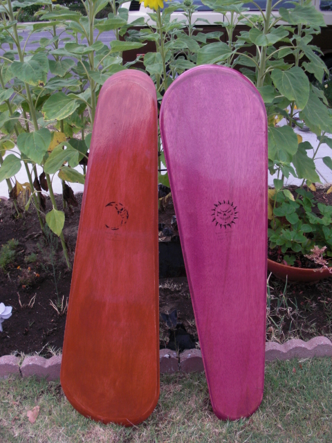 Here are two boards I just finished I call them in & out boards because you can ride them big end forward or small end forward. both ends have about 1/2" X 2" rocker in them they are 7" at the small end and 14" at the large end and 47" long. The big end works good on larger mushry waves and the small works well on more crisp waves