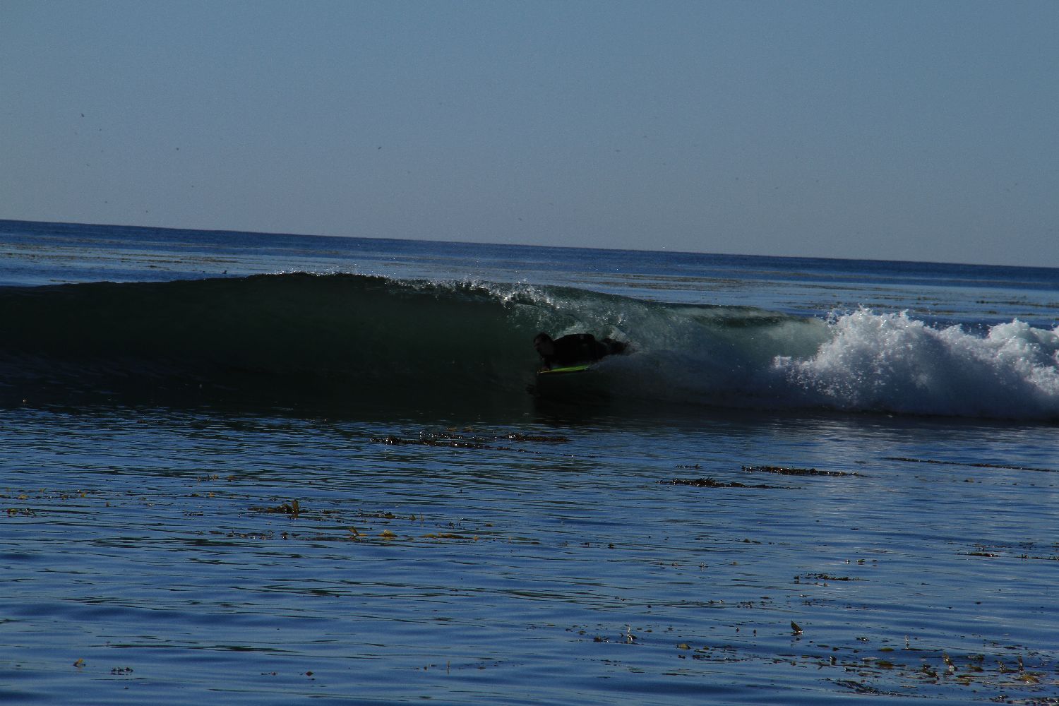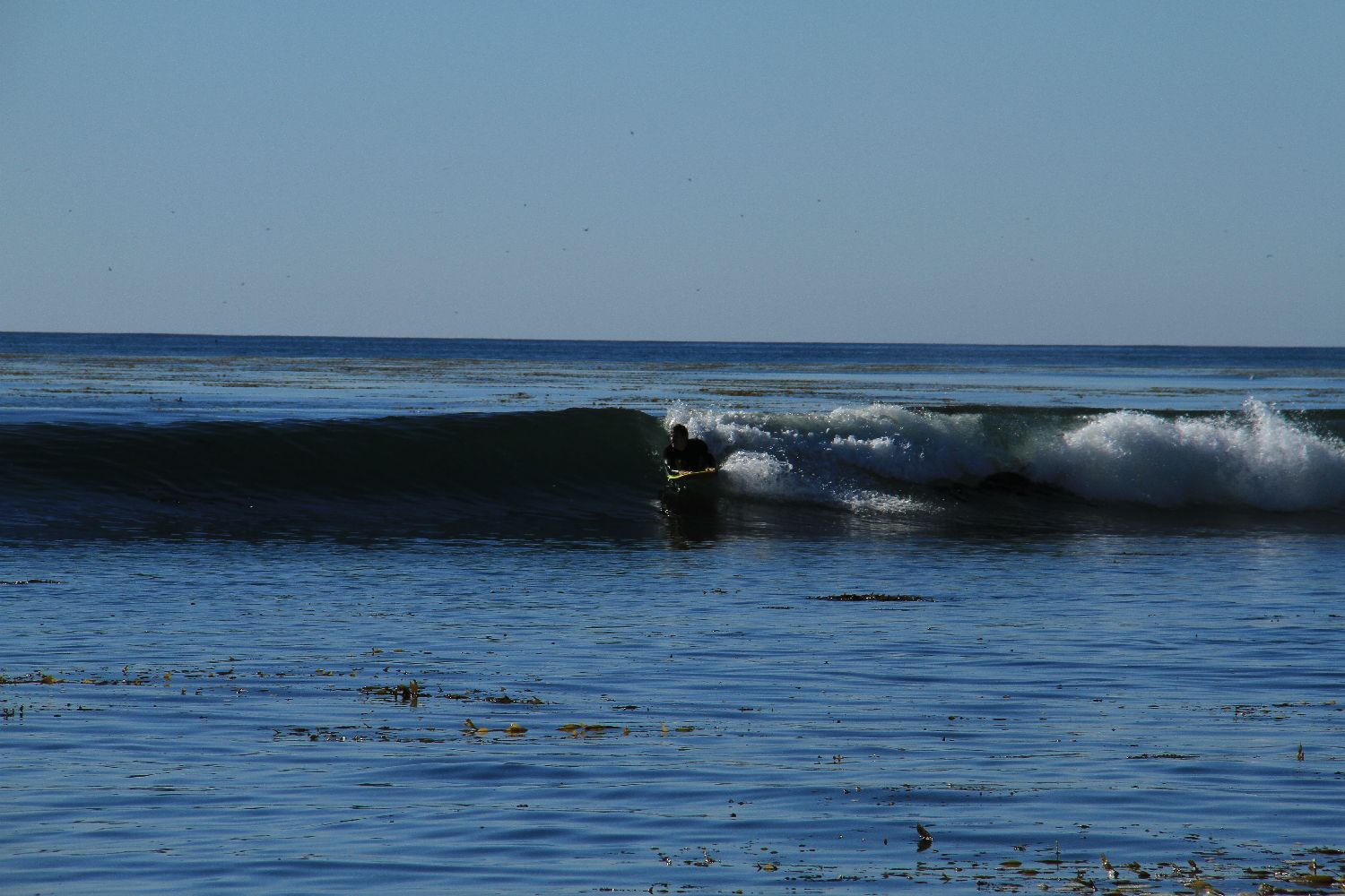 Went out on a little Mission the other day and found a nice spot dealing out some reeling little spinners for a few hours before the tide got too low, and Ross took out one of his latest acquisitions, something he's nicknamed the 'Belly Box'. It was shaped by his friend Kyle Albers, and is a 4' 6" version of a couple of combined design genres. He rides this thing prone..........as a kneeboard.....or standing up. It just..........depends.