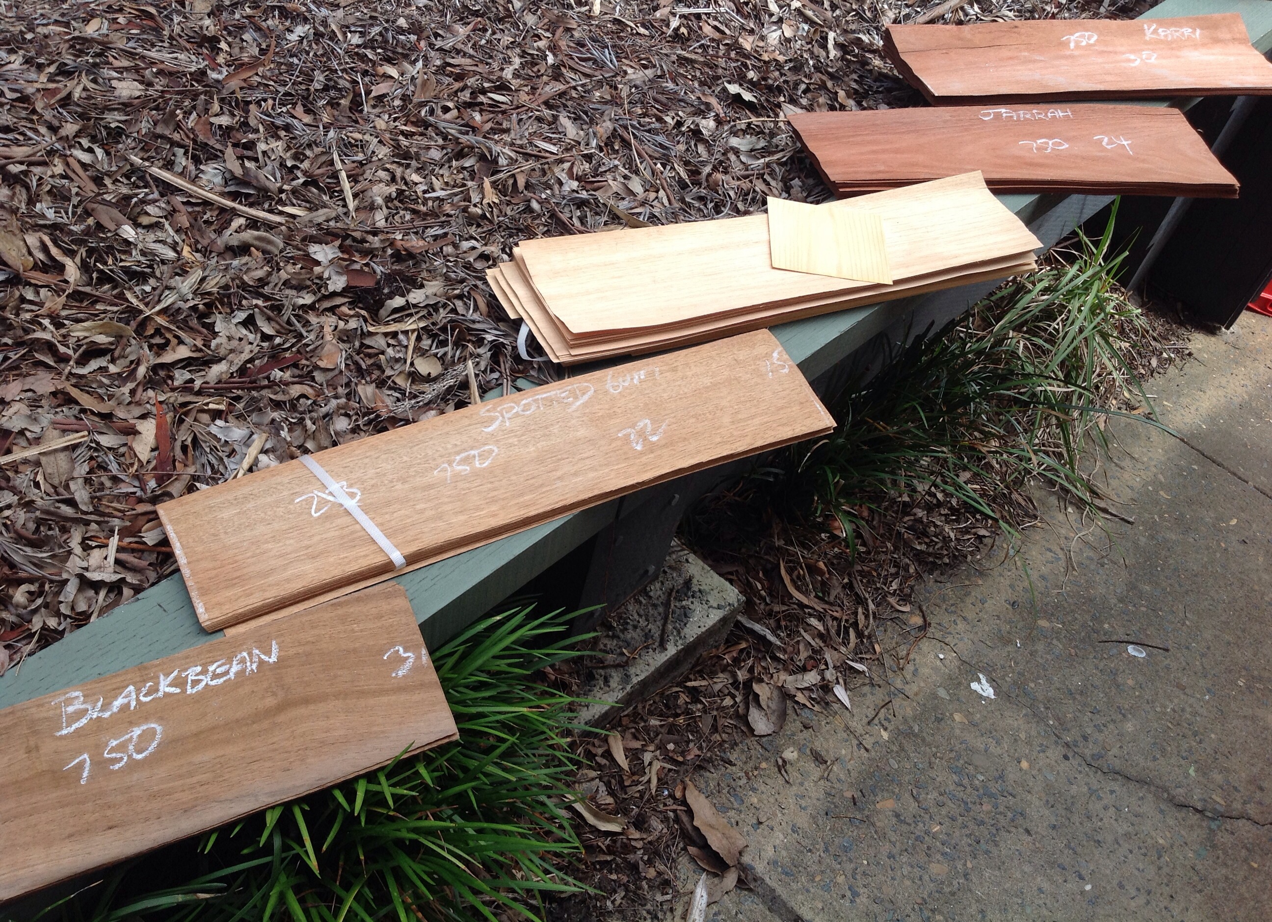 And a selection of woods to use for the veneer, there's some supple woods like pine and Victorian Ash and some brittle one like Jarrah and a Spotted Gum. The Jarrah seems stronger but it's not a smooth wood that will create a smooth surface on the final product so I'm going to use the pine and ash.