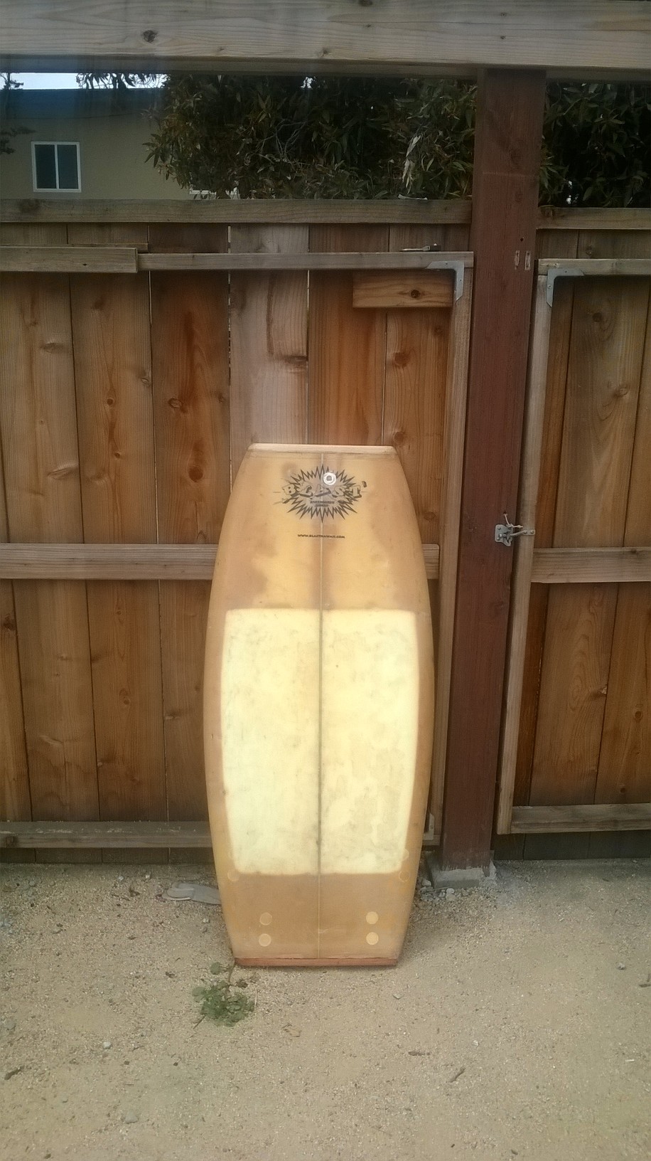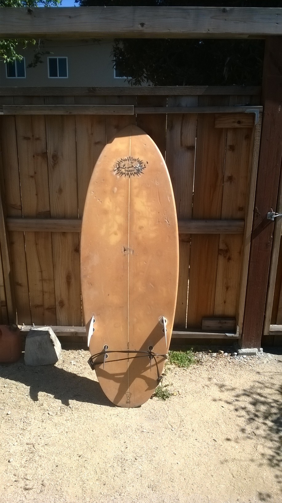 Took it out for the first time today--The waves were very poor 3' closeouts but I got a little feel for it. It caught waves easily and seemed pretty fast. It turned fine, but all I could get in today was an initial turn---cutbacks were not on the menu. So it was a fun experiment --I've been riding wooden paipos for a few years and wanted to try something with floatation and fins--I think this might be a little too much floatation but I liked the feeling. I think I will get a longboard fin box and install it a little forward of and between the side fins and play around with that.