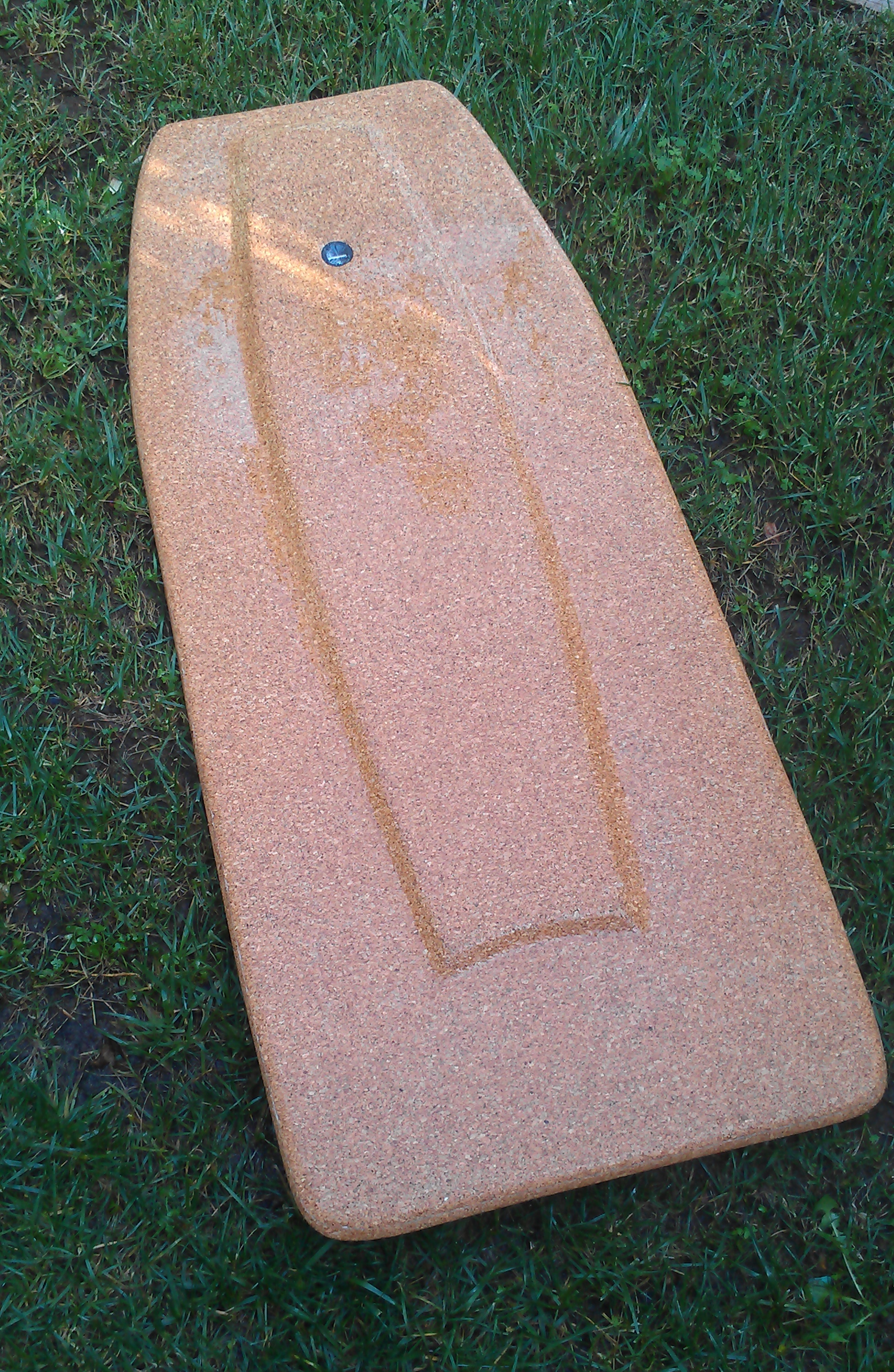 It won't work to shave the bump down to get more flex, though. If you shave it down you'll quickly shave through the fiberglass, and it's all or nothing. Remember it's the fiberglass that makes this board stiff and durable, not the cork. The cork is there for buoyancy and to act as a spacer between the layers of fiberglass. Without the fiberglass, the cork wouldn't last a single session. It's a lot like the balsa inside a ski — it adds stiffness to the composite, but you'd never make a whole ski out of solid balsa.