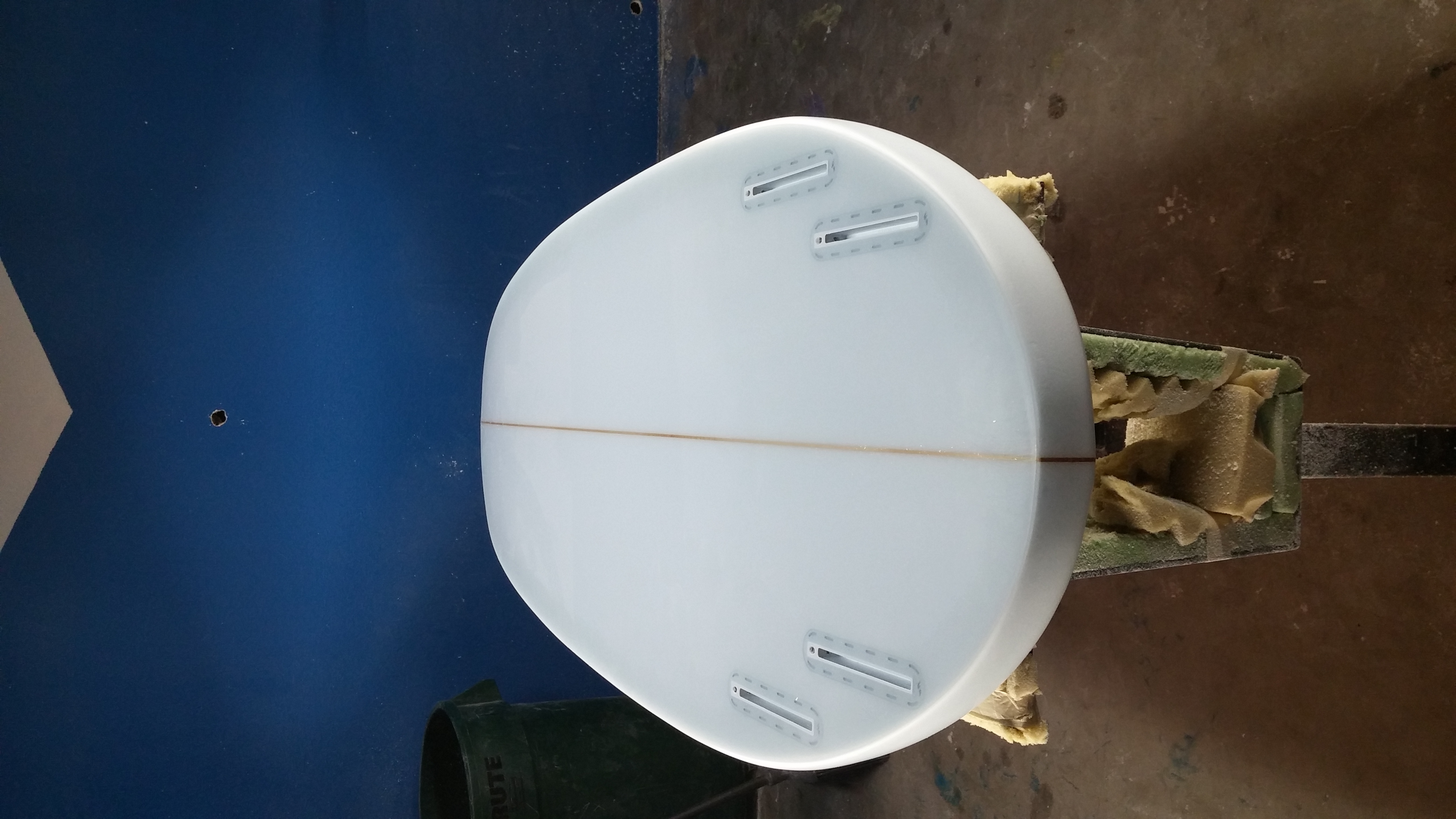 Here's my board I shaped a couple weeks ago. It's in glassing right now shaped out of poly foam. Dims are 4'2 20 at midpoint and I think it's 21 or so at the widepoint. Widepoint about 10 inches back can't really remember. Has a concave deck the whole way through and is 2.25" thick at the stringer and 2.5" thick outside of the concave. rails are pretty thin. Bottom is vee to flat midway and a slight concave through the fins. Set up as a quad with full futures boxes. My first one I did had a single going into a double and was more of a simmons plane shape. Thanks to Soulglider for letting my try one of his boards and it changed my mind on belly in my boards. This board doesn't have belly but I think I'll do one with belly on the next one. The plane shape is very much like my Tbelly I had from Thomas just with a rounder ends. Hopefully I get it in a couple weeks and will do a ride report on it. Thanks for looking.