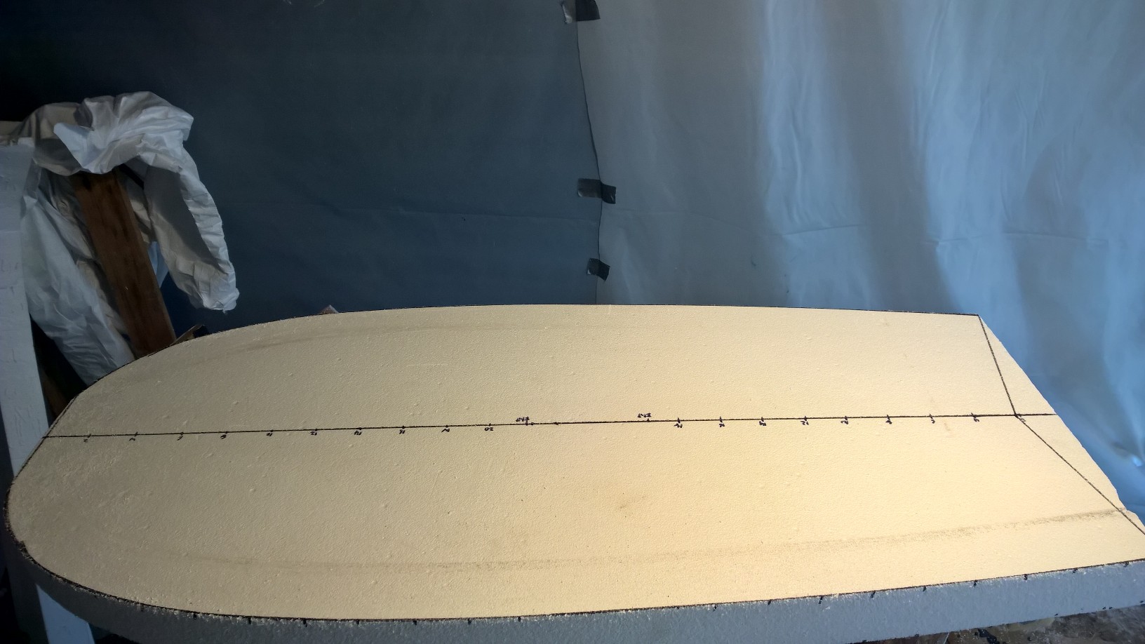 Here are some photos of my latest board. It is 48" x 21" x 2". I will be adding a 5/16" Cove pad. So it will be about 2 1/4" when done. It was supposed to have a round nose and be 48", but the foam was damaged. All drawn out on 3" 2 pound EPS foam. Cut out with edges squared With the rocker shaped 2 1/2' front 3/8" rear. Next I planed the thickness down about an inch and cut out the top and bottom rail bands ---Now It Is Finally Looking Like Something.