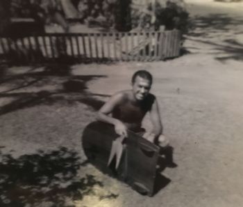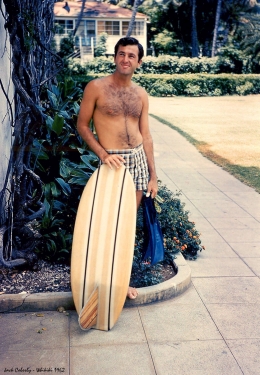 Jack with his Quigg bellyboard, Waikiki ca. 1962.