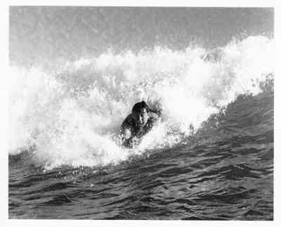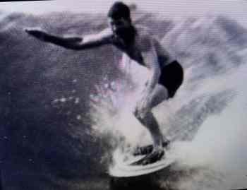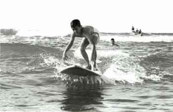 When we paddled out for my first lesson, Mac's son, David, and I paddled tandem on one board, and Mac paddled on his board with his camera in a plastic waterproof housing. David and I went out to the lineup, where David pushed me into a wave. Mac was sitting on his board 50 yards inside of us, and he took a photo of me as I stood up for the first time. I still have that photo. Besides me standing, it shows David in the water behind me and a canoe taking off on another wave outside of David.