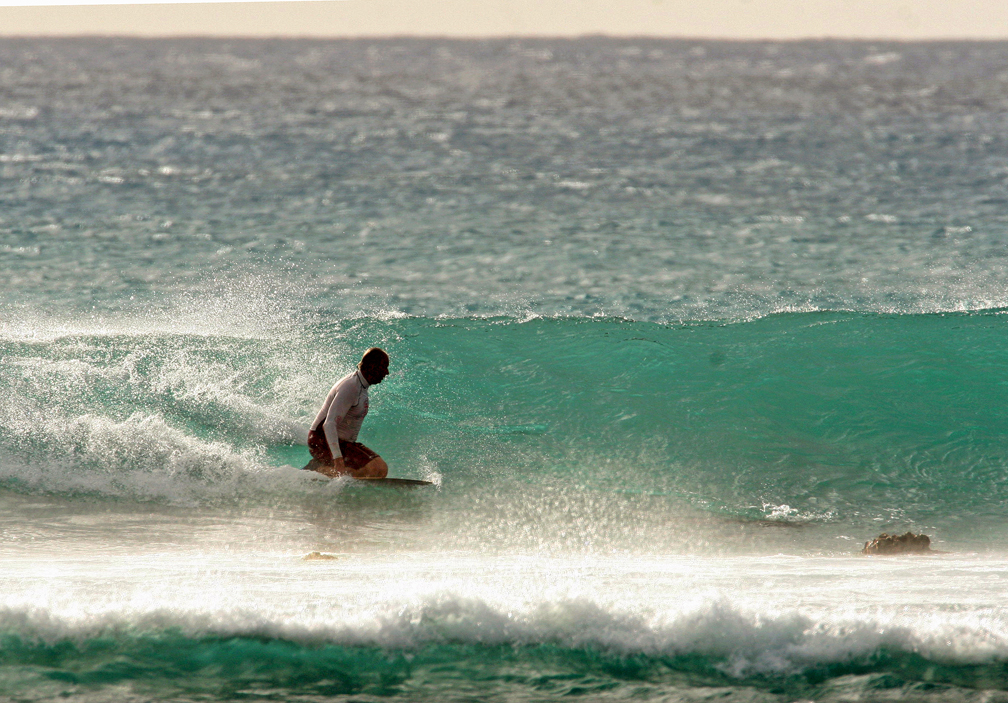 On big south swells, Publics in Waikiki has exceptionally long lefts that are ideal for paipo boards. However, Publics is also an especially dangerous surf break because of the long, shallow reef that curves into shore, creating those waves. During the spring and summer low tides, the reef is often exposed with coral heads standing above the surface of the water. It's really challenging to negotiate that reef, and it's taken a toll on many surfers and their boards.