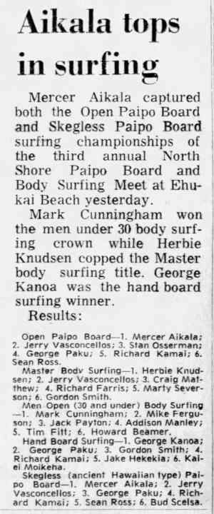 Mercer Aikala was one of the outstanding paipo riders in the 1970s. Mercer was a good friend, and I remember him telling me that in 1973 he won every paipo contest, including the one at Pipeline. He rode kneeling on his board, and his signature move was a 360 spin. The Pipeline contest was sponsored by the City and County of Honolulu’s Parks and Recreation Department.
