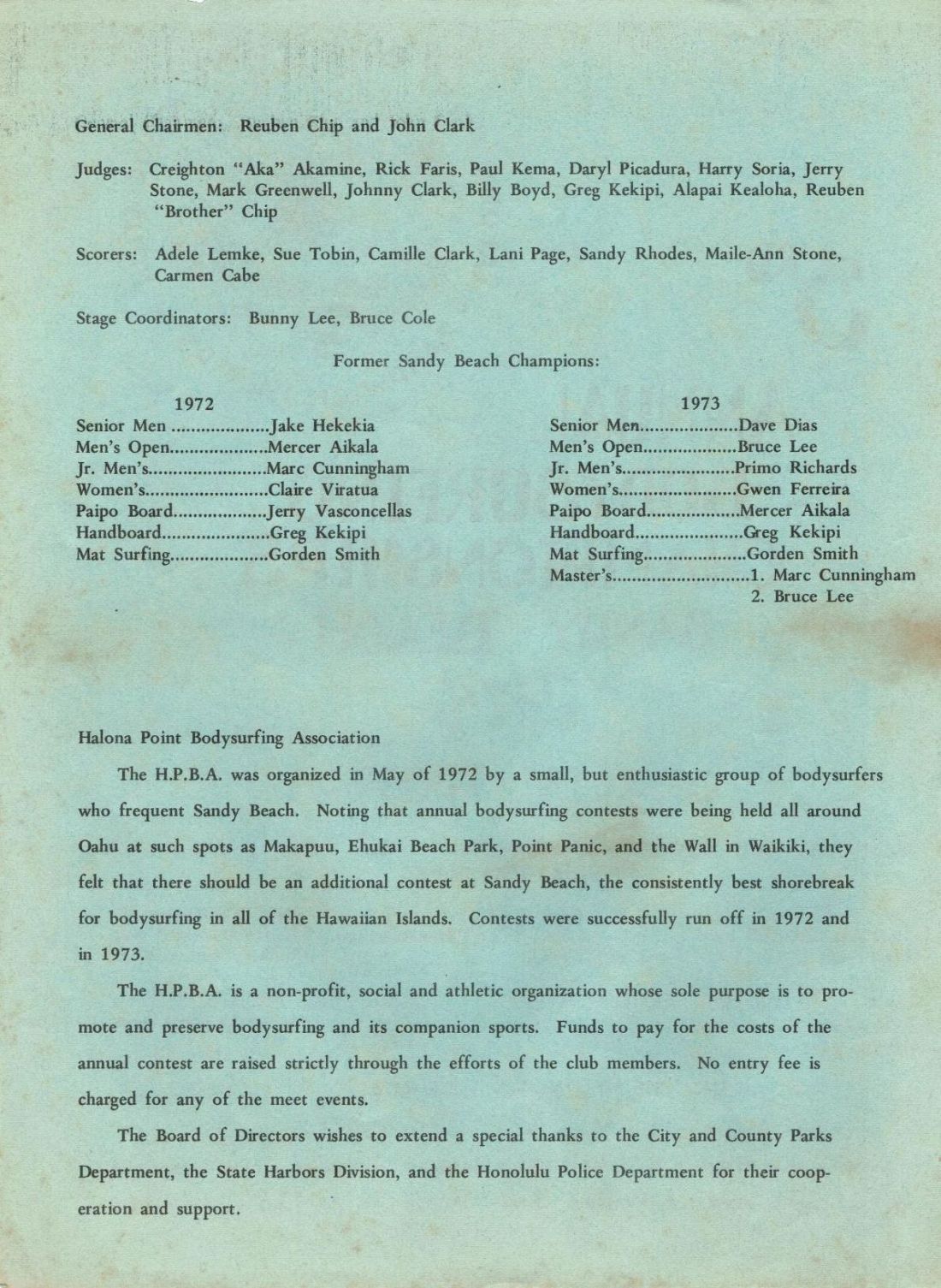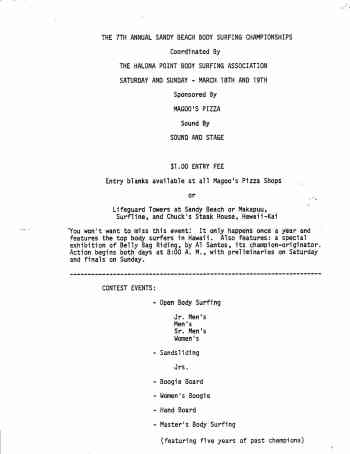 When Tom Morey introduced his foam bodyboards about the same time that we started our contest, they were a huge success. He called them boogie boards, and after several years it was apparent that they had just about replaced paipo boards in our island lineups, so in 1976 we added a men's event for foam bodyboards. In 1978 we added a foam bodyboard event for women and dropped the paipo event.