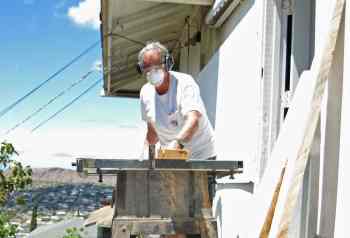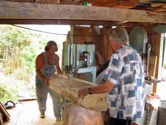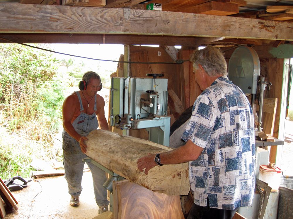 Saw mill in Waimanalo. Bud & Kini Ziegner cutting a wiliwili log. |