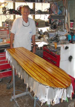 In your 2010 interview with paipo rider Stan Osserman, Stan mentions that plywood will delaminate if it's exposed to water. That's the main reason Bud preferred solid wood for his boards. Paipo boards don't have leashes, so if you lose your board and it hits the reef hard enough to crack the fiberglass, the wood is exposed to water and deterioration. Solid wood, like redwood, is dense and holds up better to water exposure.