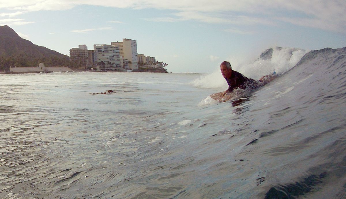 My heyday as a paipo rider was from 2005 to 2020, when I was a dedicated morning regular at Publics in Waikiki. I got started when I told a good friend of mine, Bud Scelsa, that I was going to retire from the Honolulu Fire Department at the end of 2005. Bud had been a totally committed paipo rider for years, and his favorite spot was the surf break called Publics. He loaned me one of his paipo boards and insisted that I surf with him at Publics. I did, and I loved it. When I retired, I put my surfboard in storage and surfed with Bud as often as I could until he died in 2013. Before Bud passed away, he made me four paipo boards, which I continued to ride at Publics until the COVID epidemic arrived in 2020.
