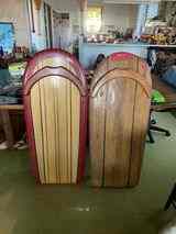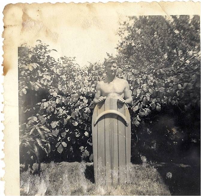 The first board he made for me was a duplicate of the boards he made for himself. Its dimensions are: 52" long, 24" wide at the nose, tapering to 22" in the tail, and ¼ inch thick. Bud only rode kneeling on his boards. He was a big guy, so he made them wide to support his weight, which was concentrated in the center of the board when he was in a kneeling position. I was the opposite. I only ride in a prone position, so I asked him if he could make me a second board shaped more like a surfboard, and he did, using redwood and pine. Its dimensions are: 62" long, 18" wide at the nose, tapering to 15" at the tail, and ¼ inch thick. It worked much better for my style of riding with my weight distributed over its 5' 2" length.