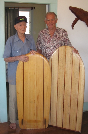 Wally Froiseth is holding his 1954 balsa/redwood twin fin paipo and Bud Scelsa with his 2012 wiliwili/koa paipo. Wally rode his board standing up and Bud rides kneeling.