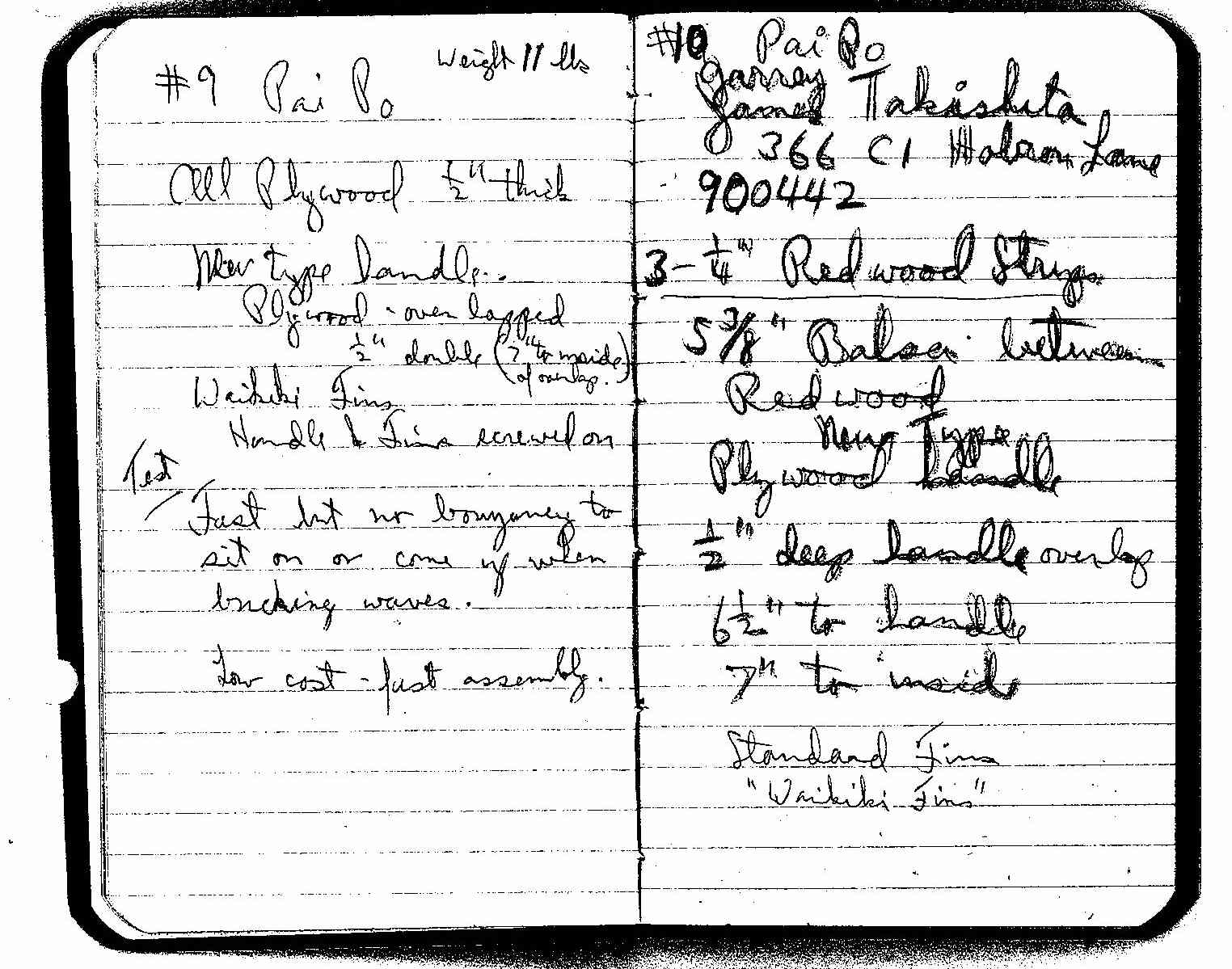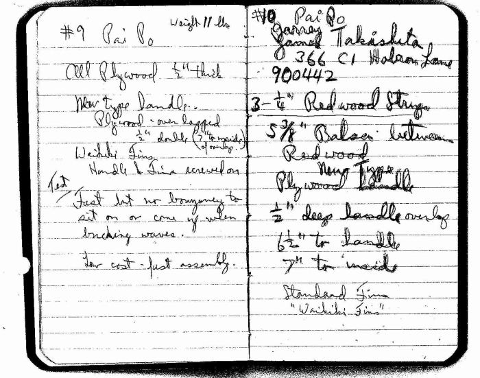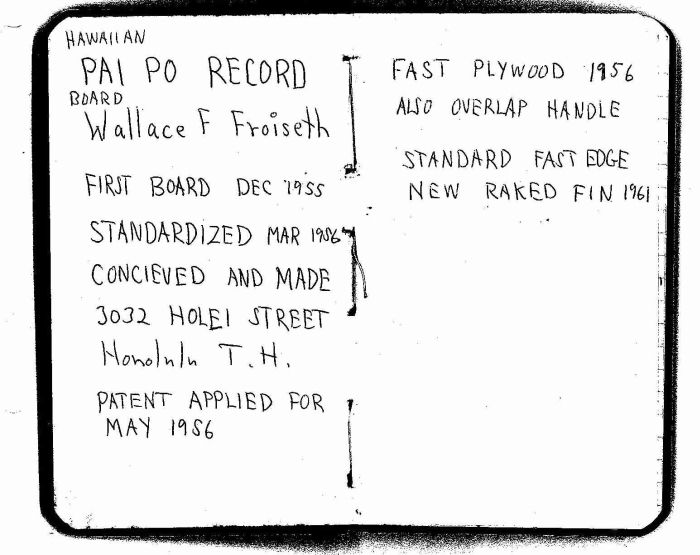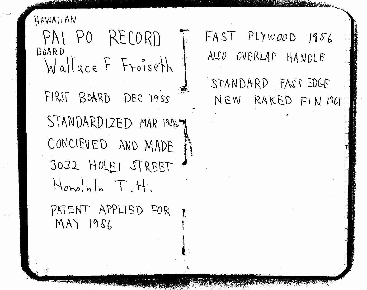 11. You had a friendship with Wallace 'Wally' Froiseth who I believe kept records of the boards that he made. Do you know if these records detail much about his experimentation with paipo boards?