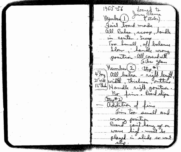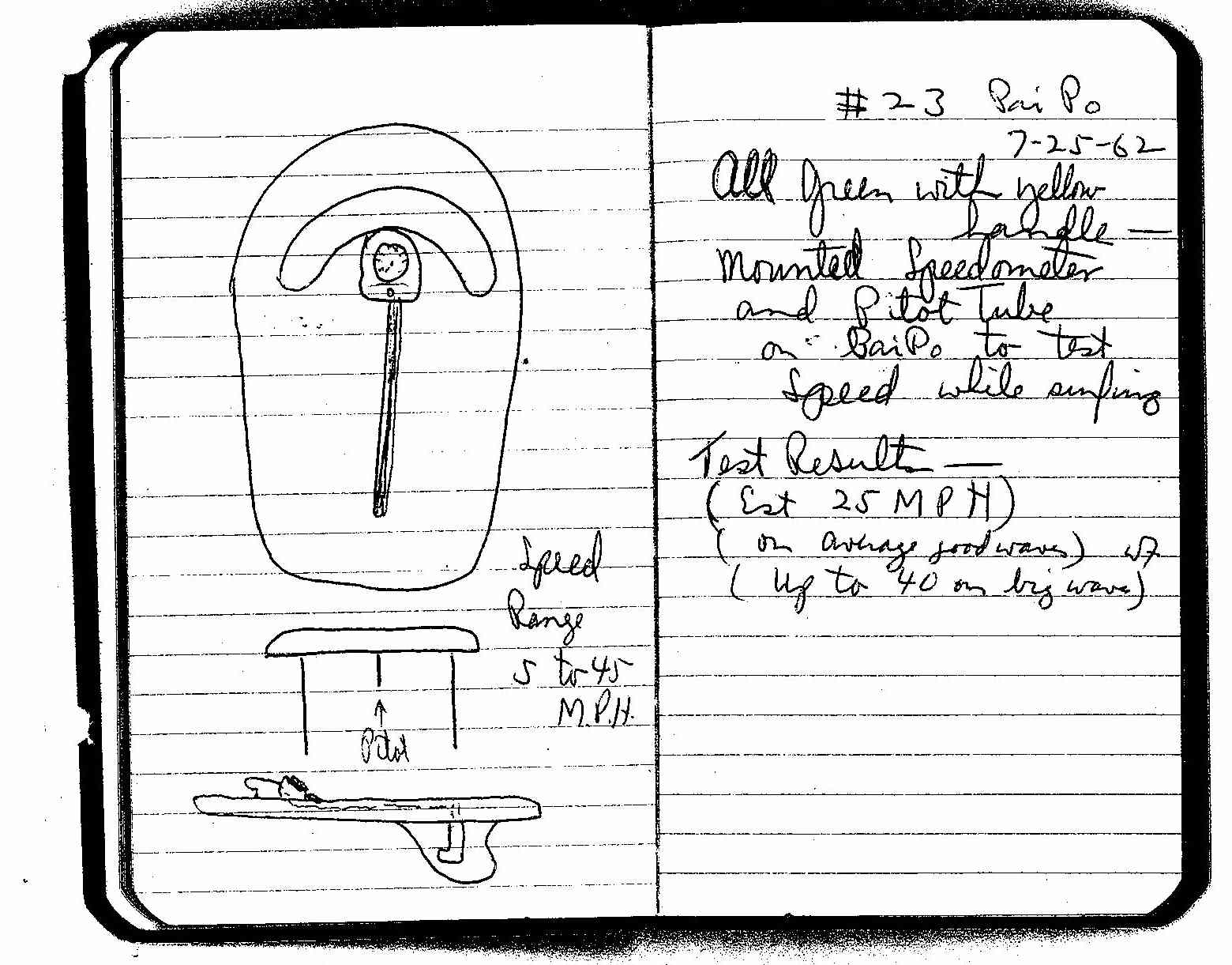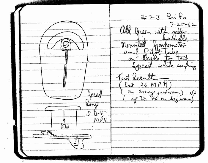 Wally kept a handwritten record of the paipo boards he made under his Pai Po logo, including those he kept, gave away, or sold, beginning in December 1955. He loaned his record book to me and I made copies of some of his early entries Note 1. His descriptions detail that over the years he experimented with different woods, dimensions, fin sizes, and fin placements. One of his most unique experiments was the installation of a pitot tube on the bottom of one of his boards between its twin fins in 1962 (See Board #23 in the Notes section below). Pitot tubes are used to determine the water speed of boats, and he thought he might be able to find out how fast he was going on his paipo boards. According to his entry for that board, he reached 25 mph (miles per hour) on good waves and 40 mph on big waves.