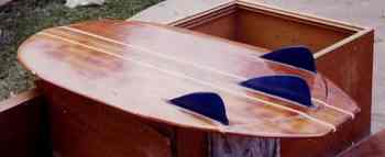 Note 1: This photo was taken at Cronulla in 1956 and depicts boards of the visiting Hawaiian-US lifeguard teams. In the foreground is a bellyboard with a hint of a single fin showing. The photographer was Barry Regan who advised that Lloyd Webster, Ronnie Bowler, Neal Stenhouse and Nigel Dwyer started riding bellyboards at Cronulla in the late 1950s. The other evidence for the use of single fin bellyboards comes from photos of a 1958 surf trip to Avoca, in Ray "Dags" Greenaway's old Austin A30. The balsa bellyboard in the photos belonged to Ray "Hitcho" Hitcheson. After the 1960s there were various attempts to make fibreglass bellyboards (e.g., in the 1970s Terry Atkinson from Gordon and Smith glassed a board shaped by a friend of Jim McNamara, Graham King made a small single fin board and Anthony O’Neill from Emerald surfboards in the 1980s made twin finned, boogie board style boards) but they never gained the popularity of the wood or ply boards of the 1960s.