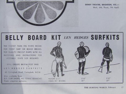 Source: Advertisment. (1966). Belly Board Kit. The Surfing World 7(4), 17. Photo courtesy Gary Clist. |