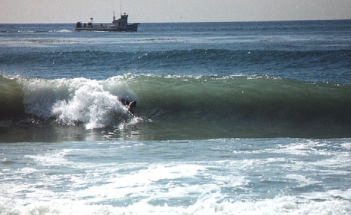 The first two shots are in sequence. I don't know who the rider is. He's a bodysurfer, right? I'm not inclined to name the beach, either, although it certainly isn't any kind of secret. Pretend it was your favorite beach, and you caught it in early October with a fair crowd but enough rising swell that there was room for everyone, at least once they got caught inside a few times. Looks like it could be 1952, but it isn't. |