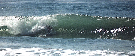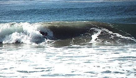 This one (Above) looks like it could be Hawaii or Indonesia. The bodysurfer is doing what, in surfing days of yore, we used to call "taking gas". Without the burden of surf or bodyboards, bodysurfers can just tuck and tumble or dig in and pull out - it's really quite nice to be free. |