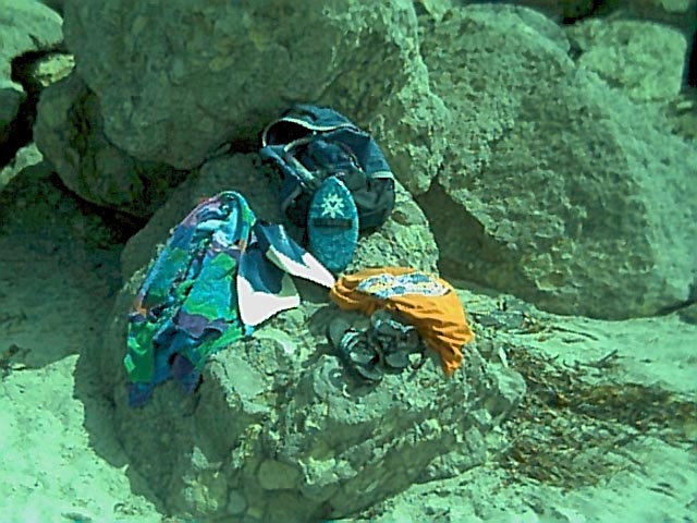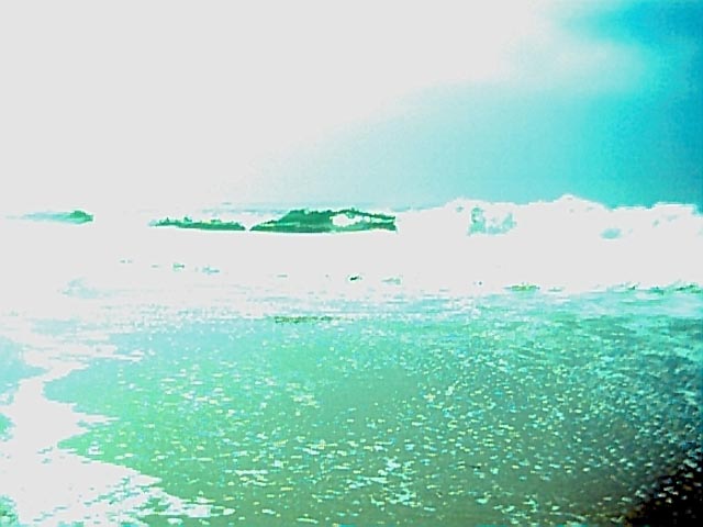Take a look at the wave on the left. Elida was still thumping, and the sun came out. This is a "pocket beach", one of those places which really are too nasty to surf, with submerged rocks, funky wave shape, and currents.No parent in their right mind would bring a child here. No surfer would risk a $350 thruster on it. I came to bodysurf. I know the picture isn't much, but look just above dead center; see the pitching tube? A closeout, yes. As I swam to the base of the waves they would pitch out so far that I would be in the shade of the lip before I got close enough to dive under. |