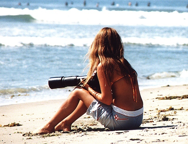 (Below) Her's IS bigger. She outgunned me in the lense department, and still had film when I ran out, so she got all the girl surfing photos this morning. There are many aspects of the surfing life beyond the actual riding of waves. Shooting surf photos is a great learning tool, as it forces you to flow, anticipate, react, and then critique your work. |