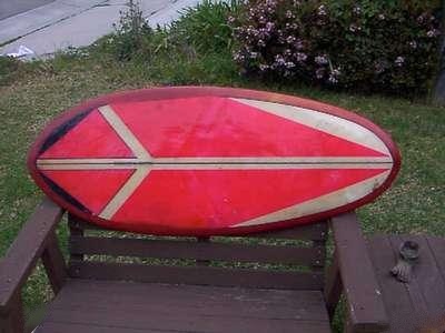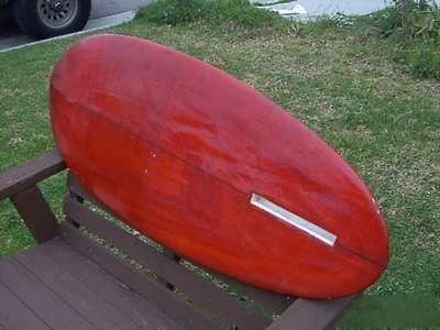 Here are two views of what was identified as a G&S Paipo, probably of the late 60's or early 70's vintage. I've practically seen more delams in the decks of new boards at local shops than are visible on this 30 year old warhorse. Anyone with specific information on this board is welcome to share it here. All the email said was 47" long, which was longer than most production paipos of the day. |