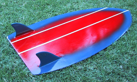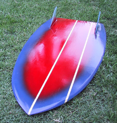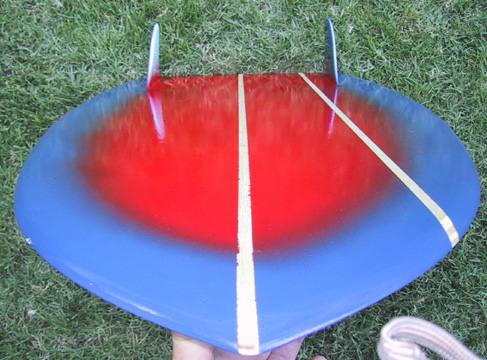 When another surfer loaned Roger Wayland a vintage Newport Paipo Concave Vector model to photograph and get dimensions from, he got pretty excited about the whole design. The actual boards are now over 30 years old, so actually riding one belonging to someone else (in that case the original owner) is an iffy thing. Roger is blessed with a lot of energy, so he took the measurements and some plywood he had and made his own replica. Given the thinness of the original, these designs have fairly neutral bouyancy to begin with. Wood floats slightly less than the thin foam, but the design can validly be tested. Roger built this board as you see it here and had it in the water on the same weekend. Think about that cycle time... |