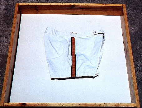 By 1970 the "surf trunk" as we know it was on the scene. Both Hang Ten and Golden Breed, among others, were big sellers in the surf world. Surf trunks were the new thing then - swimsuits like the one you see here were the standard for even coastal America. Button closure, a liner inside, and narrow leg openings - looks like some 50's Hawaiian beachboy thing. The cotton canvas was pretty soft, however, and the colors made that all-important tan stand out across the beach. |