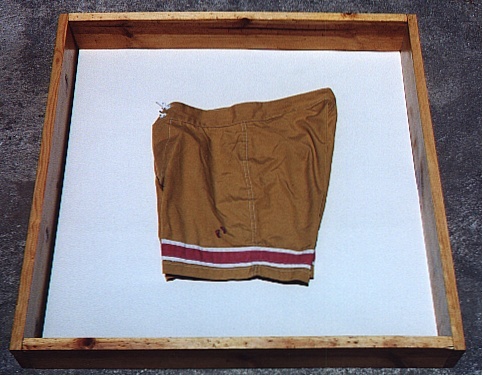 I bought this pair at the old Surfline Hawaii shop in the International Marketplace, Honolulu, Hawaii, summer of 1971. Dwight Weatherhead, of Cleveland and Daytona Beach, was with me. I was 16 years old, going to summer school, running around the capitol of the Pacific during the Vietnam War. Imagine just finishing your sophomore year in high school and meeting guys 2 or 3 years older than you, "celebrating" survival of their first 6 months in Vietnam. With 6 more months to go... Surfline was a pretty hip place at the time. I could recognize some people like Bill Hamilton when they stopped in, but these days others who worked there get mentioned in issues of The Surfer's Journal with regularity. These trunks have seen water time all over Oahu and California. I've been told that in 2001 a lot of so-called "pros" seldom get wet in Hawaii anywhere other than the infamous 7 mile strip of the North Shore. Poking around the Oahu of 30 years ago was something between magic and privilege. Hawaii has changed, but I still have the trunks and the memories. Don't know what happened to Dwight. |