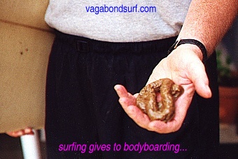 I was walking down a beach lane one fine summer morning when a guy saw me carrying a bodyboard. The surf was about 1 foot, the tide low and making what little waves there were close out. Water temperature was as warm as it gets in this part of California. Too small to bodysurf, too crappy to board surf. I just wanted to get wet.
