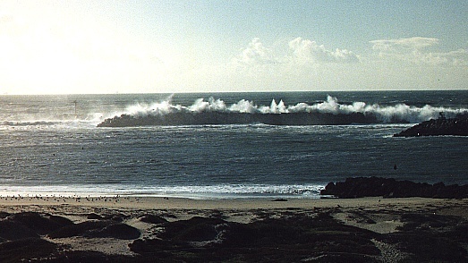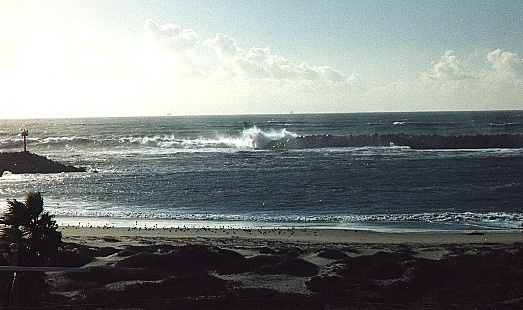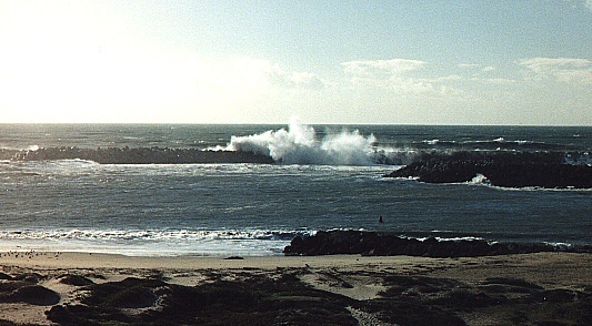 Once upon a time, a long, long time ago, the Winter surf would pound these shores after heavy rains had filled in sandbars in the entrance to this harbor. Those with keen interest used to take off in front of the South Jetty (left in the photos) and ride into the harbor. This was just about the time when the surf leash came into being, although these rock-strewn coasts were holdouts against that invention. |