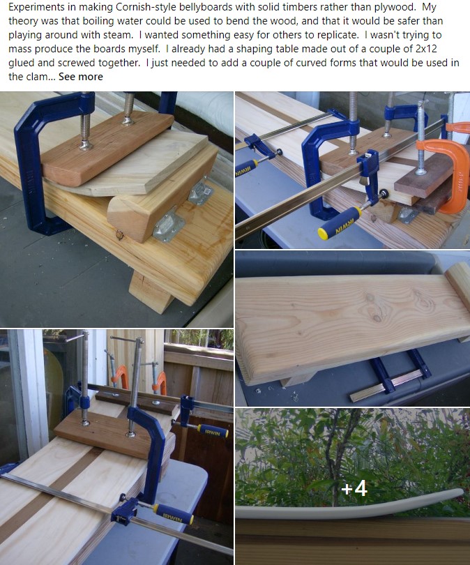 I know it looks severe, but I was trying to replicate a vintage British bellyboard. It was also about experimenting with bending poplar, because at the time, I couldn't find anything about it on the internet. Most of the info was about ships and model airplanes. I had the general idea that I needed about 200 degrees F to make the wood plastic. I also read that steam is used for both the heat and to get moisture into the wood. But I wanted to try soaking and boiling for safety reasons, and it wasn't until a couple years later that I came across the history that the vintage marine plywood bellyboards were bent after boiling. Also that a ladder or a ladder style of fixture was used to bend a batch of boards. I've also used my bending method on shorter boards and handboards.