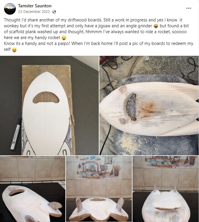 My thing was always using driftwood I found on Saunton, there is something about making something from a piece of wood that's been washed up that makes it feel more connected to the ocean. One day a beaut of a piece washed up and I drew a template for it and made my first board of 5, it was kind of like the ocean gave it too me.